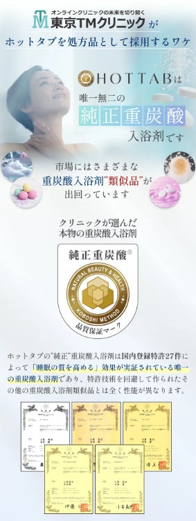 東京TMクリニックが“くすり湯”として処方に値する重炭酸入浴剤は、純正重炭酸入浴剤としての重曹・クエン酸・ビタミンCだけを固めた、上記の純正重炭酸入浴剤の品質保証マークを付した、処方品だけです。消費者の皆様には純正重炭酸入浴剤*¹を簡単に見分け間違いなくお選びいただけるよう、純正品品質保証マークを示しました。純正品*¹は全製品パッケージの表面または裏面にこの品質保証マークを記しています。