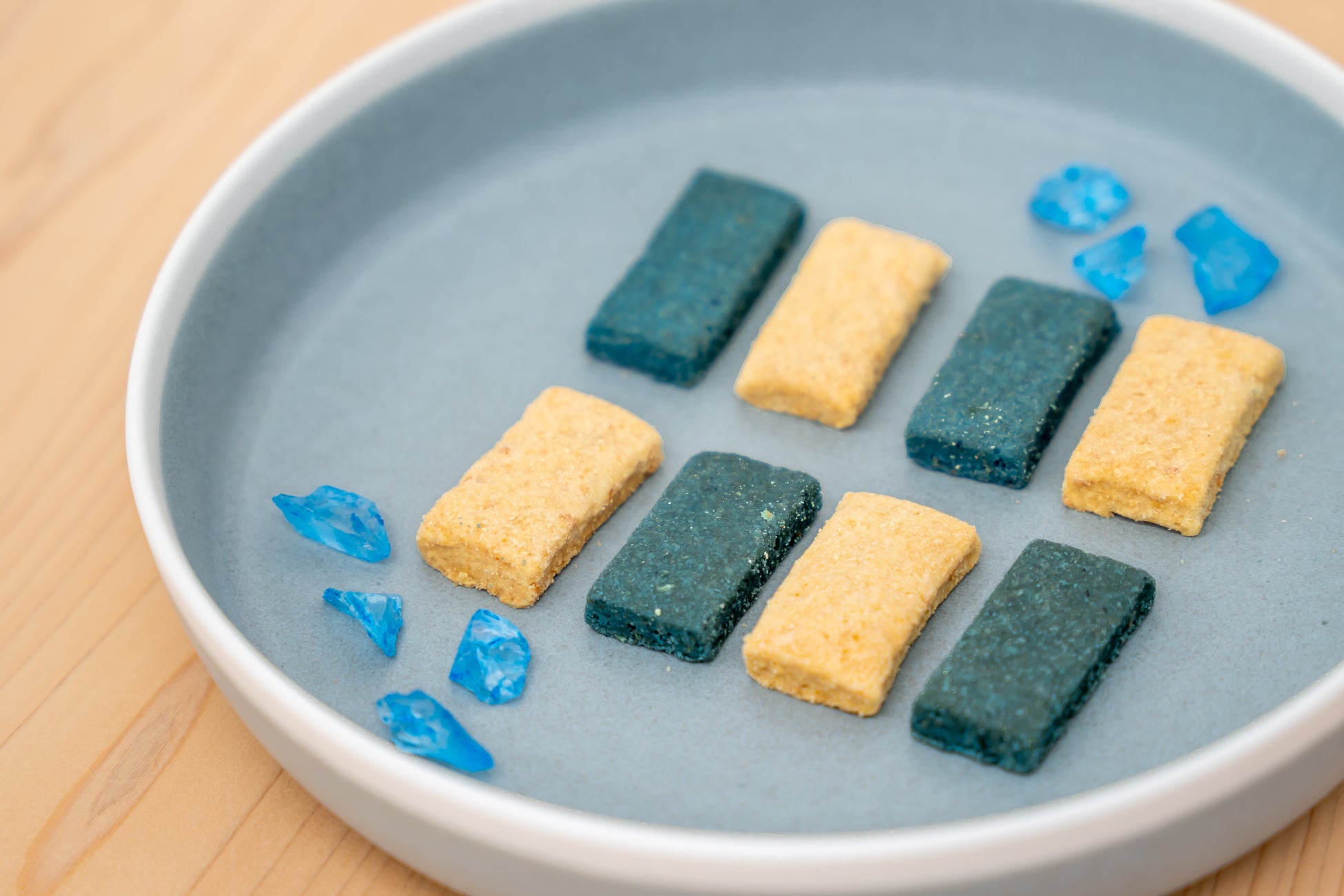 真っ青な色のクッキー。食べ物にはなかなかない色であるため、食べるだけではなく「見る」「飾る」楽しさもあります。ほかの白川郷おからのまめなクッキーと並べてみたり、ケーキのデコレーションとして飾ってみたり、色を生かしたさまざまな方法で楽しんでいただきたいです。