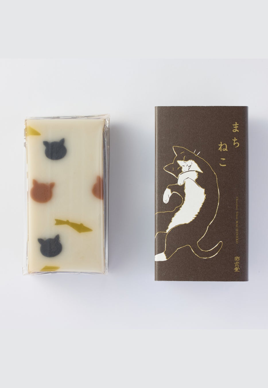 彩雲堂では、チョコレート羊羹「まちねこ」を、直営店舗、オンラインショップ、各地催事にて販売いたします。