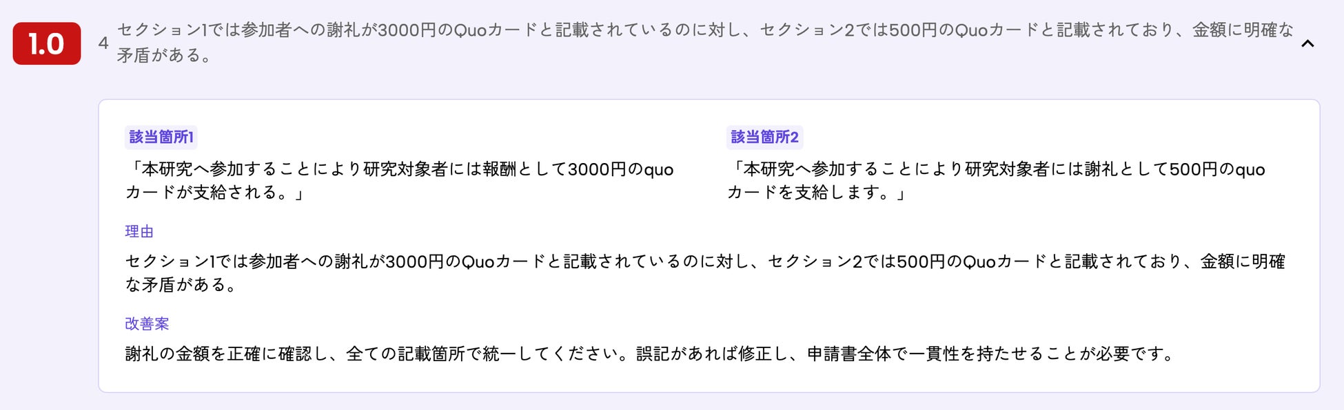 矛盾検知:研究計画書内で相互に矛盾する記述の検知や、研究計画書とインフォームドコンセントの間で矛盾する記述をAIが検知。人間では気づきにくい記述の矛盾もAIなら確実に発見できます。