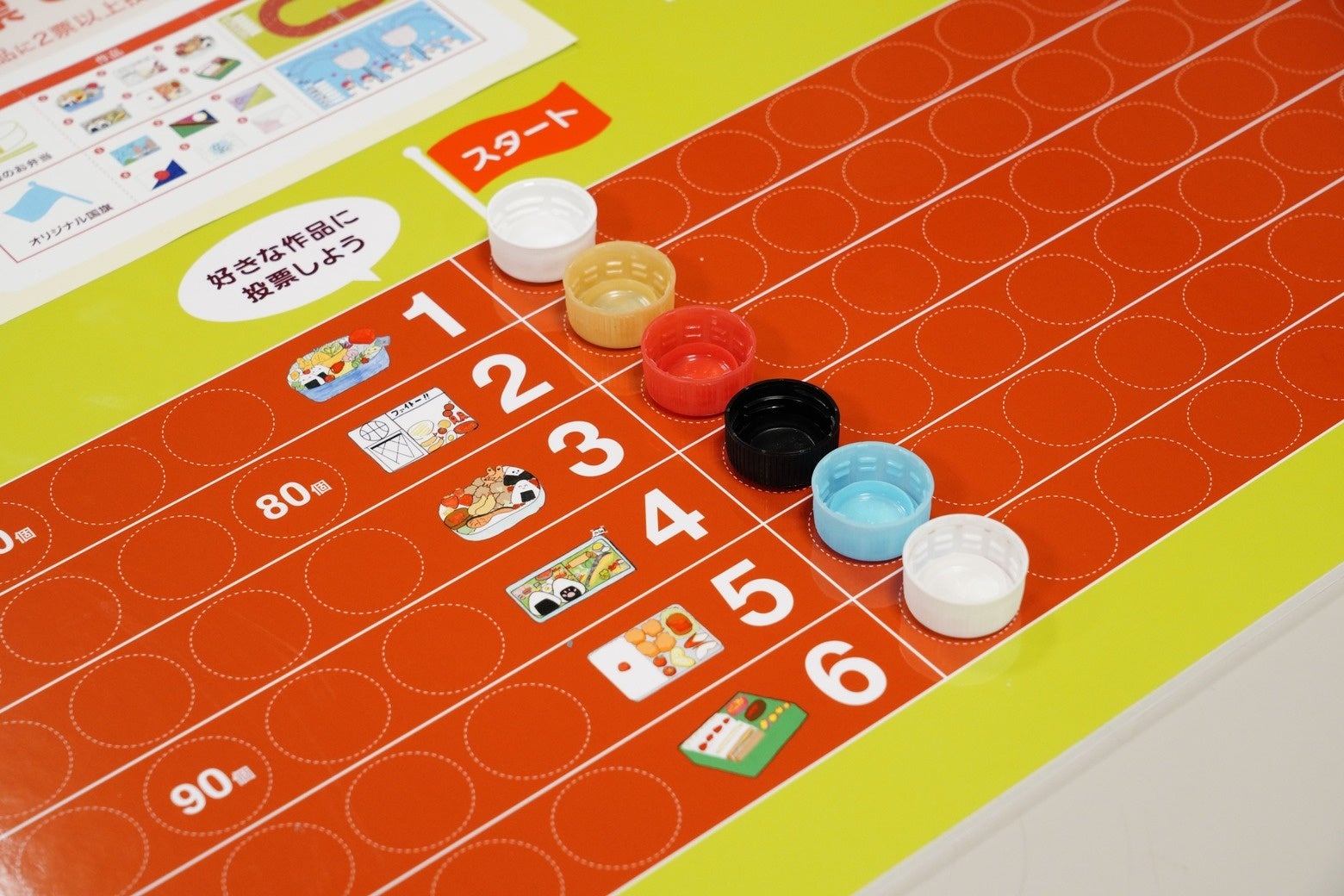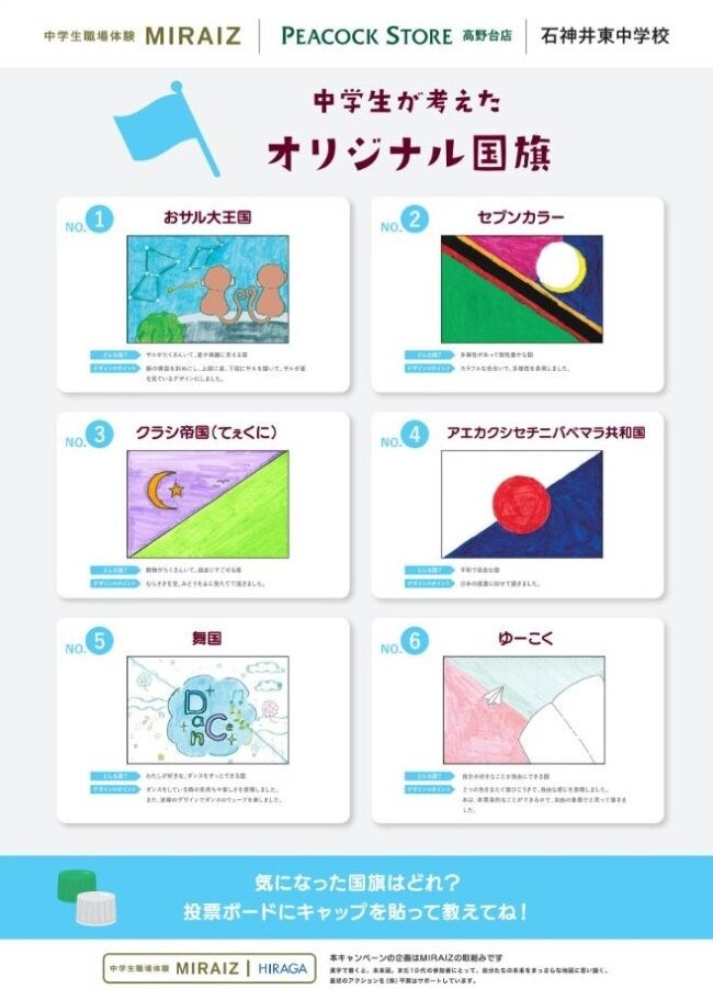 今回のイベント内容は、ピーコックストア高野台店を訪れた方々に、中学生の考えた理想のお弁当とオリジナル国旗の中から、気に入ったものへ『ペットボトルのキャップ』で投票してもらうというもの。投票参加に合わせてペットボトルキャップ回収のご協力も呼びかけました。