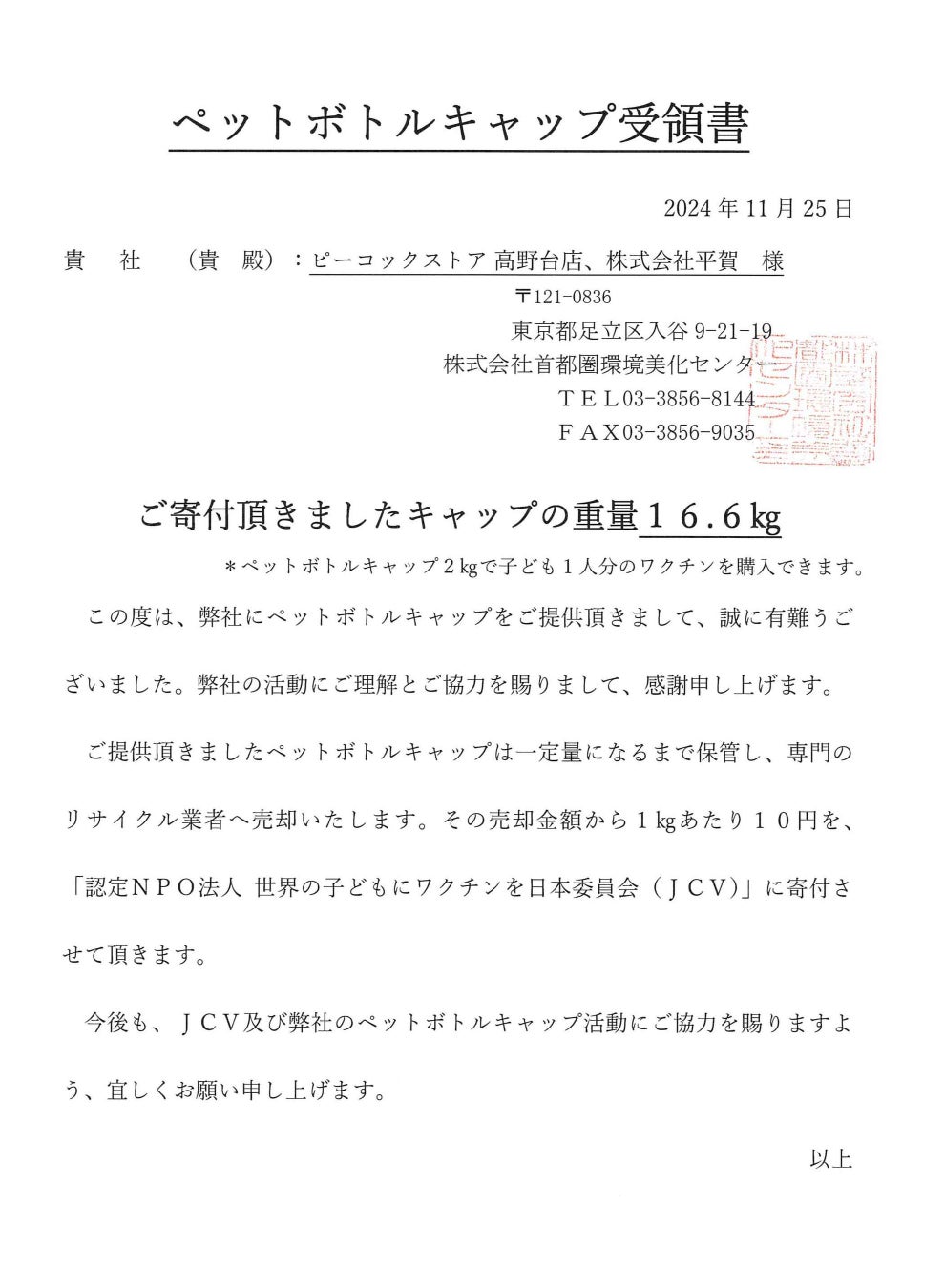 今回のペットボトルキャップは株式会社首都圏環境美化センター様を通じて寄付いたしました