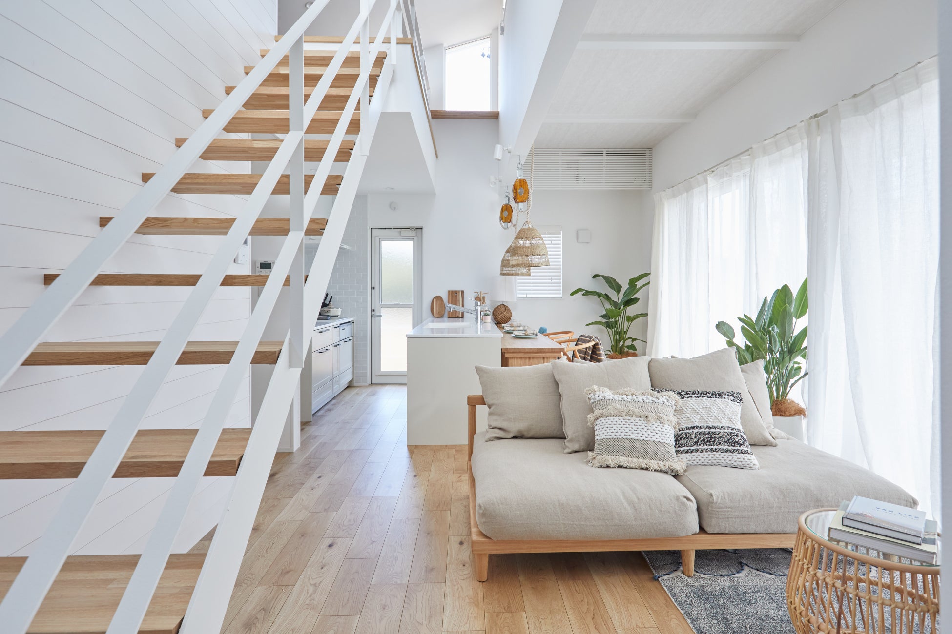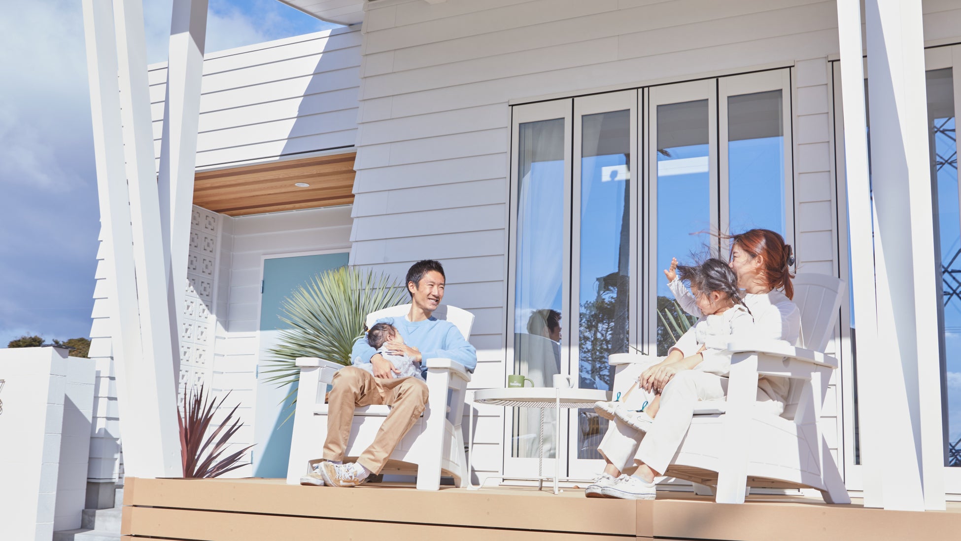 モデルハウスは、潮風と陽射しを感じるカリフォルニアスタイルの外観を採用。外壁には塩害に強く、長期維持管理が容易なラップサイディングを使用し、海辺の環境に適した設計となっています。