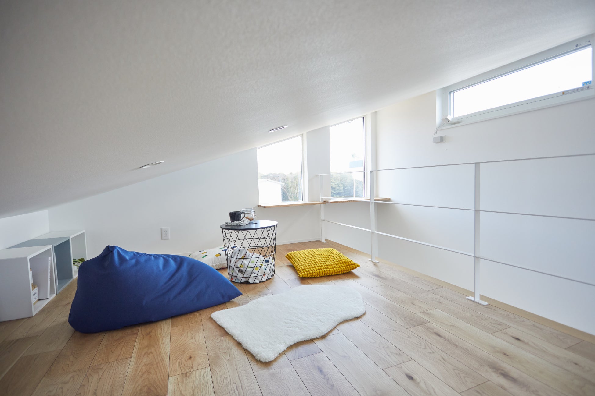 高い天井、天井付近にある窓からの光、外壁に呼応したデザインの羽目板が、空間の広がりを強調してくれるため、実面積より広く感じられます。海が見える家に似合うよう、内装にも天然木をふんだんに取り入れました。