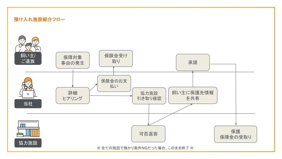 飼い主さまがご自身の病気や死亡といったやむを得ない事情で愛犬・愛猫と一緒に暮らせなくなったときも、安心して“ちいさな家族”である愛犬・愛猫を保護団体へ託し、その先の永く幸せに生きる未来を守る業界初の保険サービスです。安心して託すことのできるセーフティネットワークと、託した先で必要となる飼養費用の両方をサポートします。さらに、保護団体への預入時に必要な費用を保険金としてお支払いすることで、飼い主さまやご家族の金銭的負担も支えます。
