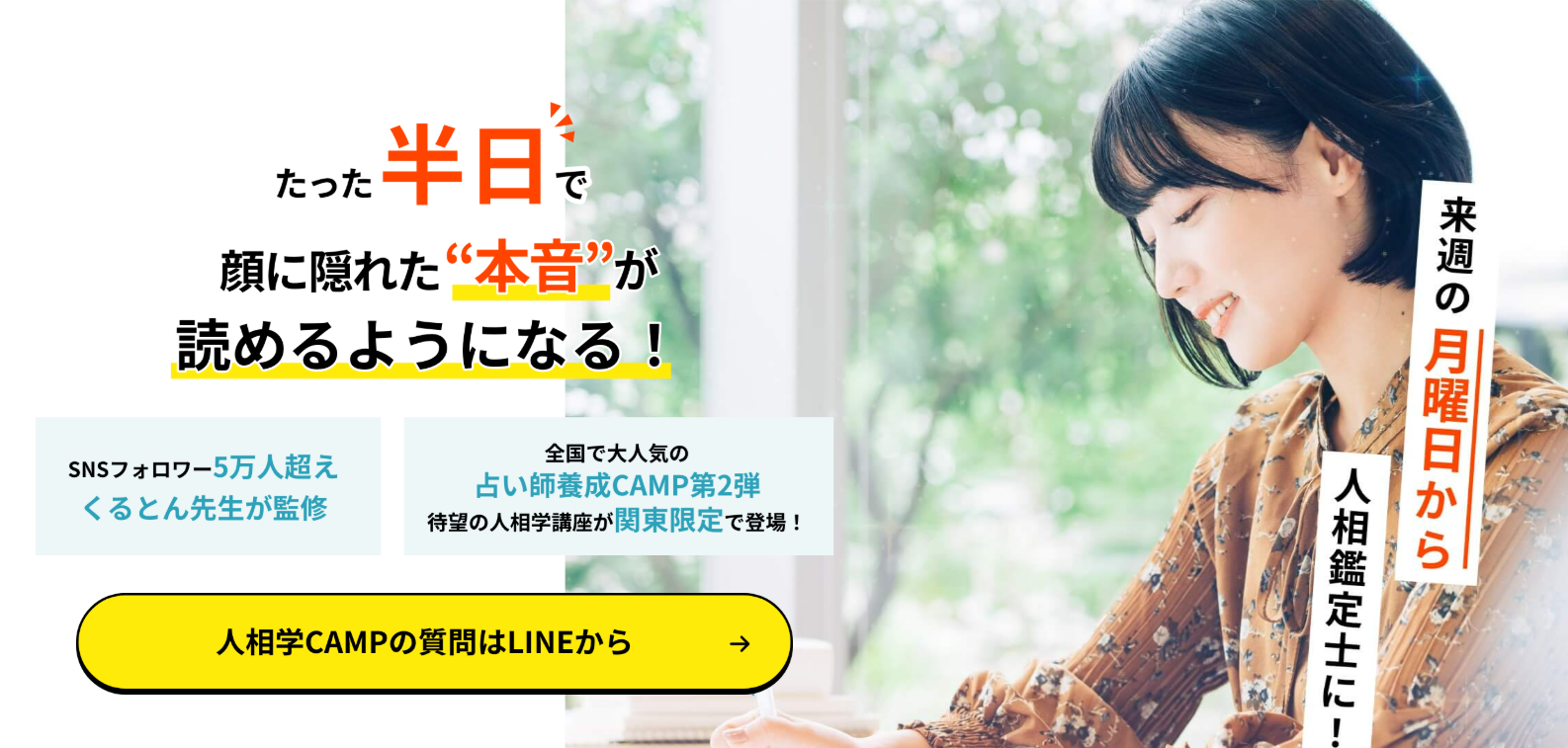 SNS総フォロワー数6万人を超えるくるとん先生が人相学CAMPを監修しています。くるとん先生は占い師養成CAMP・人相学CAMPの占いCAMPシリーズ、そして占い館ミルキーウェイの代表占い師でもあります。