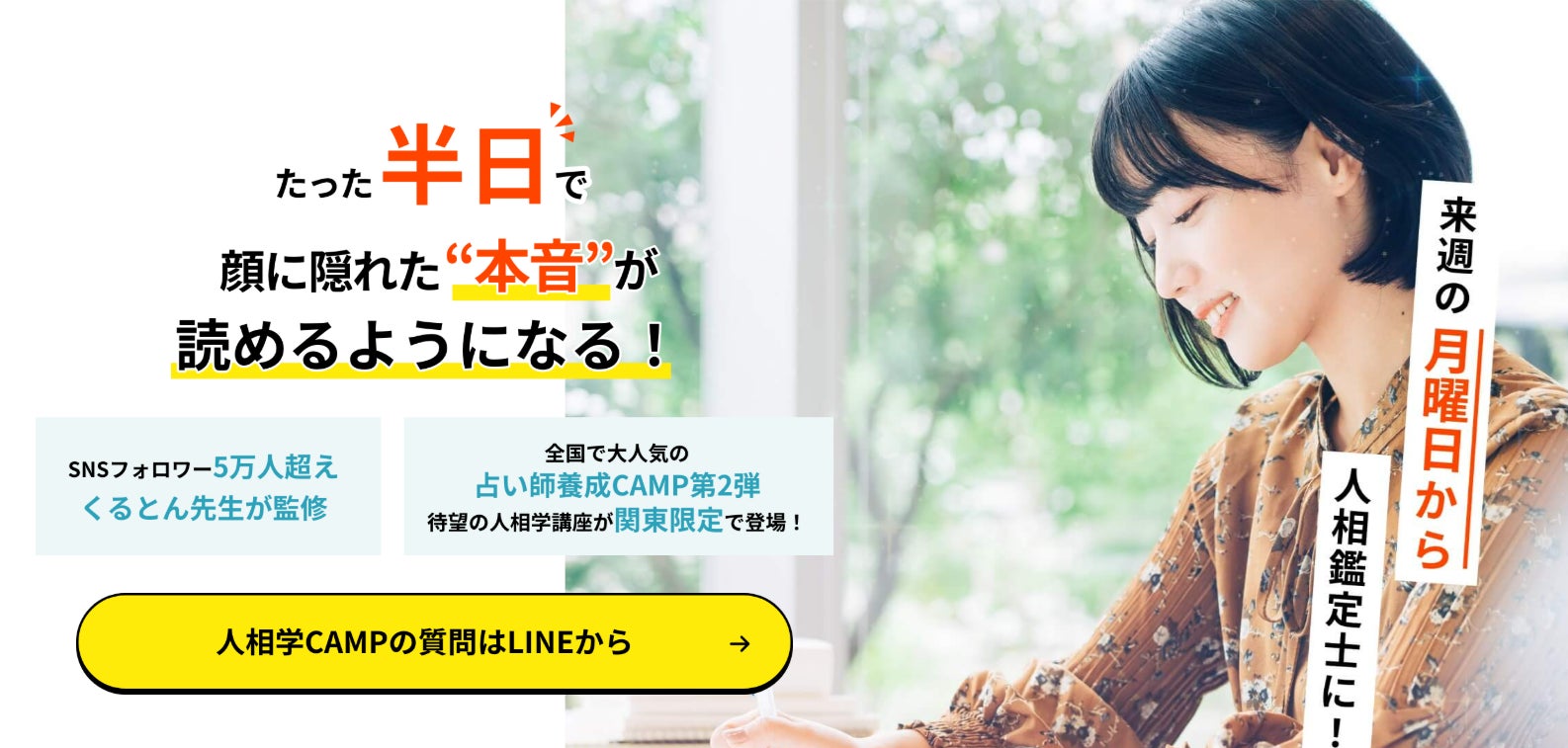 占いCAMPシリーズ第1弾のタロットと手相を土日で学ぶ占い師養成CAMPが全国47都道府県で大人気!第2弾はたった半日で人相鑑定ができるようになる人相学CAMPをリリースします。
