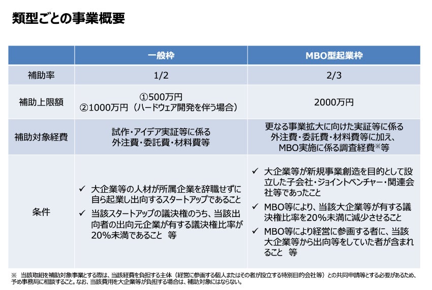 「出向起業に係る補助⾦」については、⼤企業等の社内では育てにくい新規事業について、当該企業社員が、辞職せずに外部VCからの 資⾦調達や個⼈資産の投下を経て起業し、起業したスタートアップに⾃ら出向等を通じて新規 事業を開発することを、補助⾦交付により促進させる取り組みです。