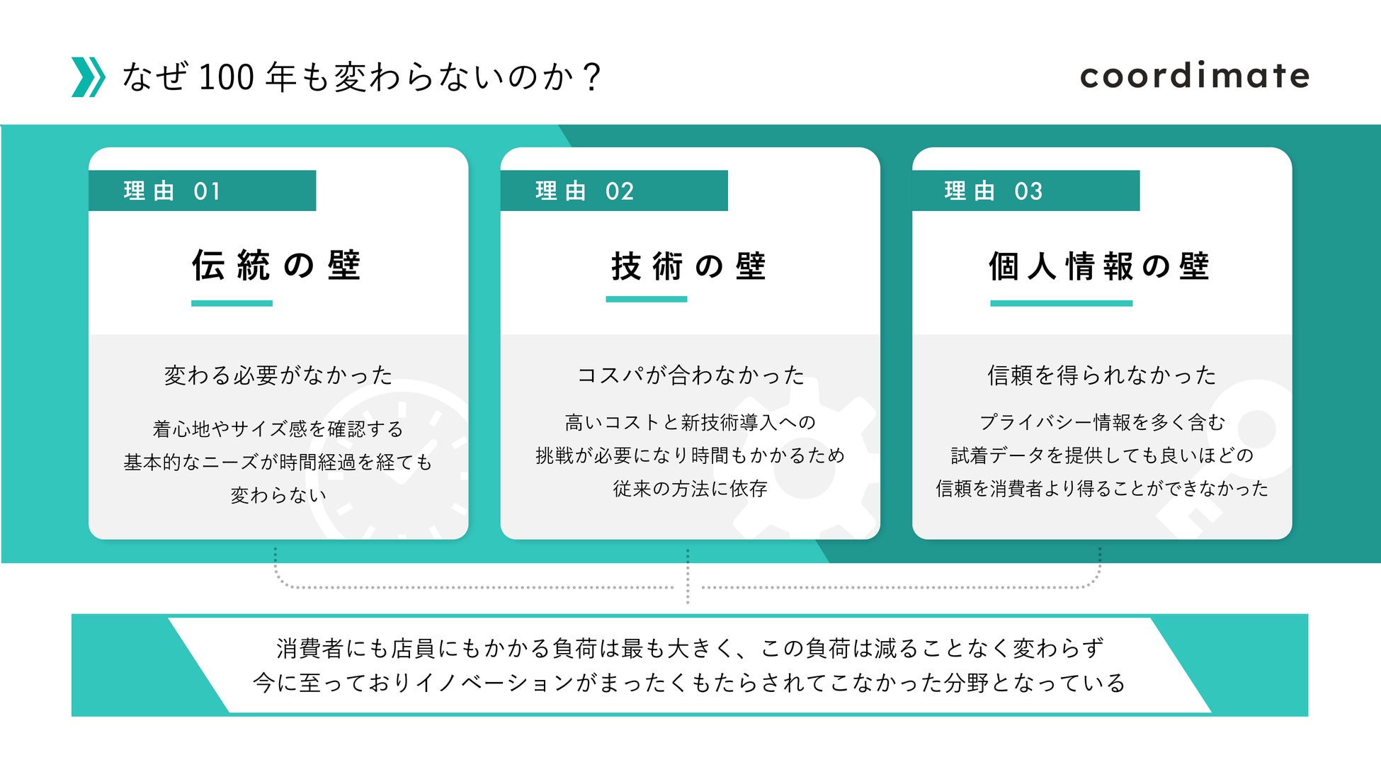 私たちはcoordimateを通じて100年間変わらない試着体験の変革に挑戦し、ファッション相談を気軽な機会として日常に根付かせることで、世界で1番安心して失敗できる場所をつくることをめざしていきます。