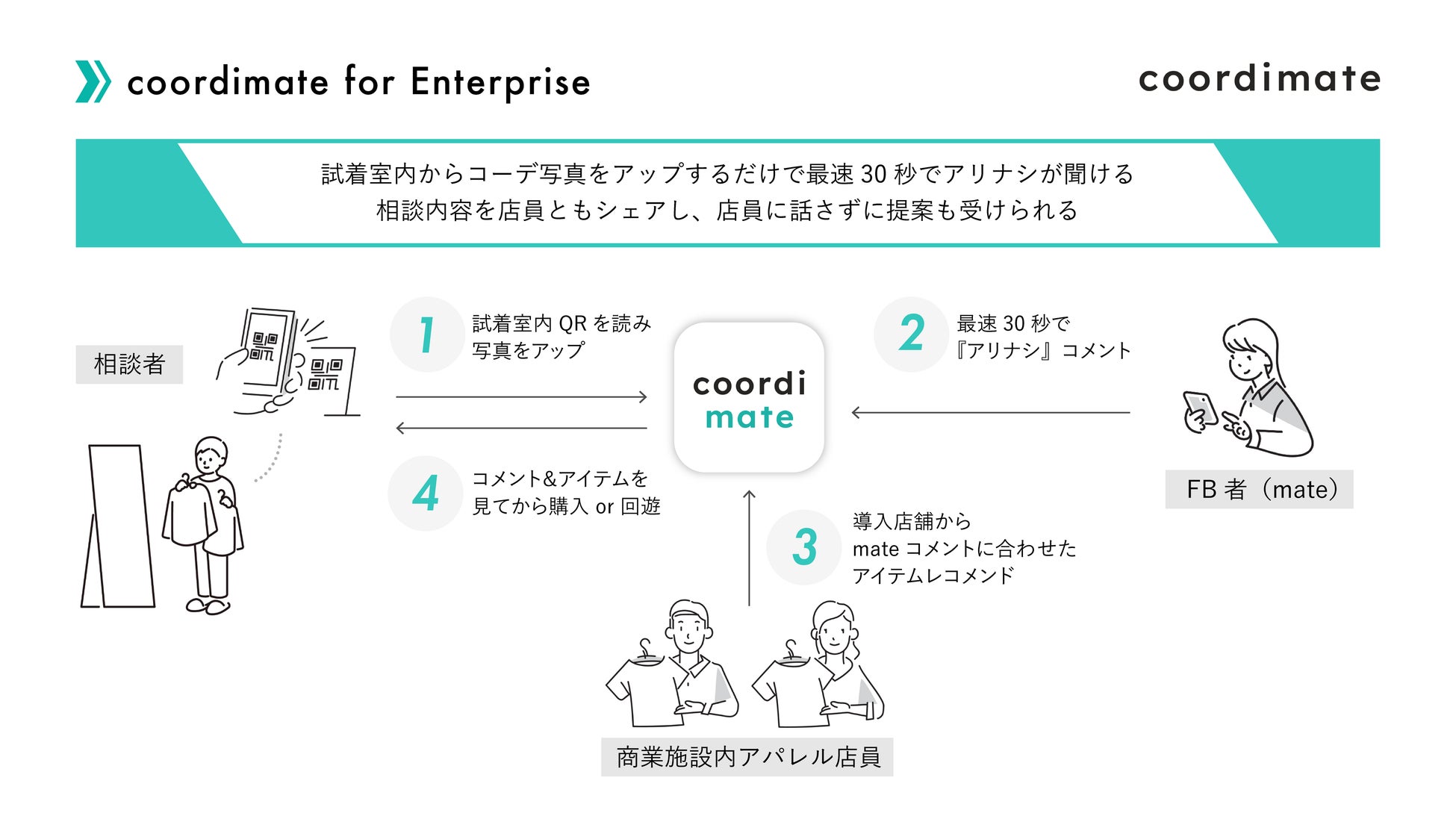「coordimate」はC向けには自身のファッションを投稿すると、ファッション好きの一般男女「mate(メイト)」から「アリナシ」のリアクションやアドバイスといったフィードバックを最短で30秒でもらえるファッション相談アプリ「coordimate(コーディメイト)」を運営しています。B向けには100年間根本的に体験が変わらない一方、年間100億回実施される「試着体験」をDXしていく試着DX事業を行っています。