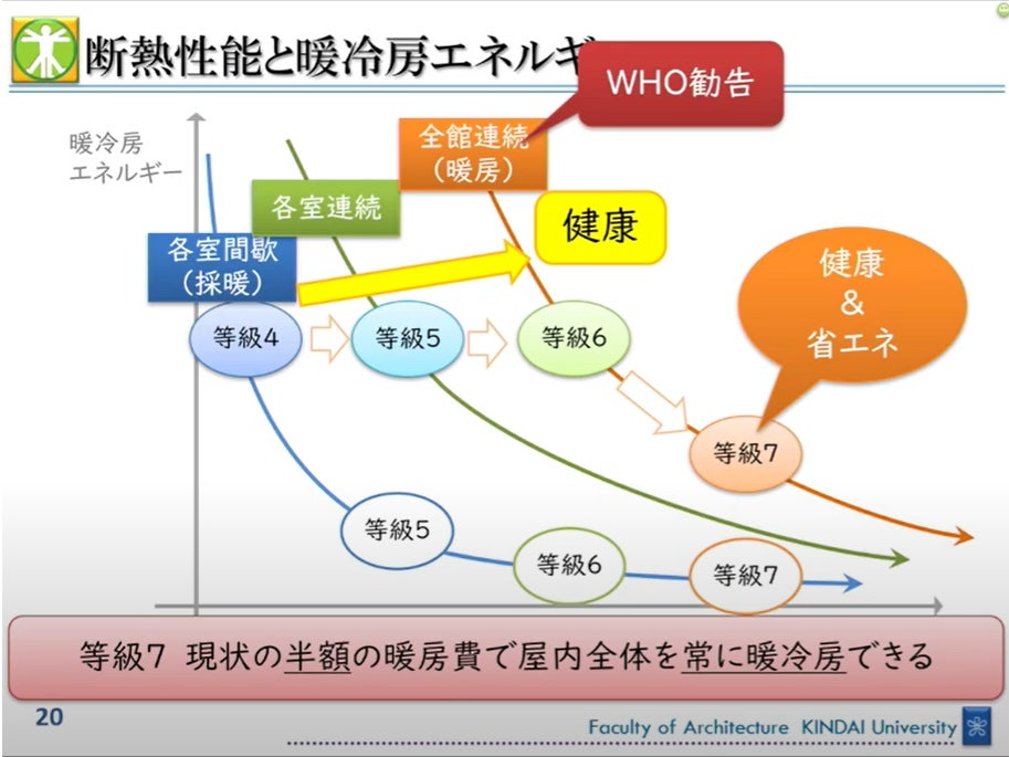 断熱性能と省エネの関係を見てみると、断熱等級4以降で省エネ率のUPは見込めないものの、等級が上がるごとに、同じエネルギーでもより健康的な住環境を提供でき、特に等級7では等級4の時と比較して半分のエネルギーで健康と省エネの両方が向上することを、ご説明いただきました。