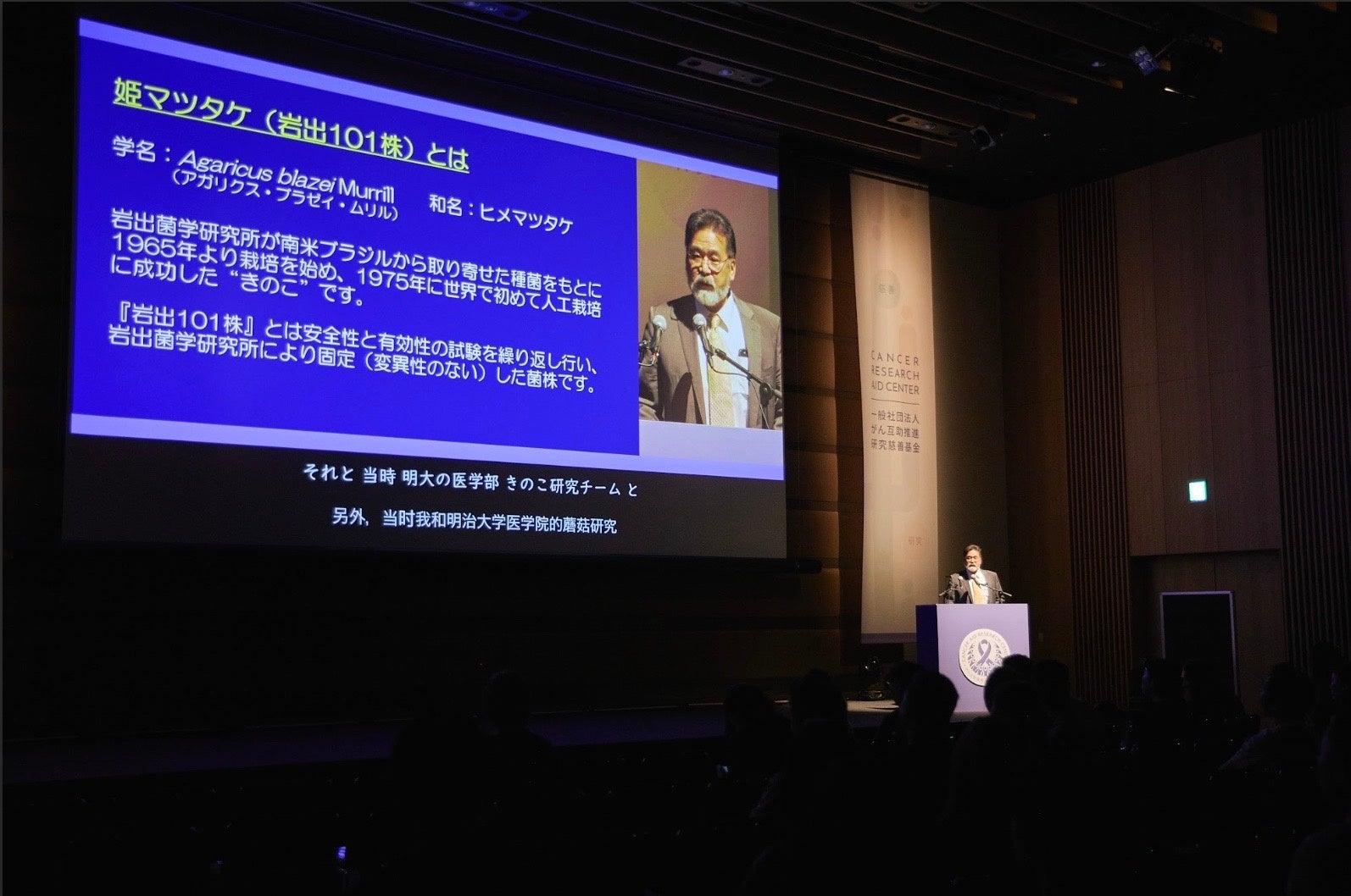 当法人より基金の目的と今後の取り組み そして、岩出菌学研究所と三重大学の共同研究によって開発された、ヒメマツタケ由来の水溶性抽出物CP-101新成分について発表いたしました。