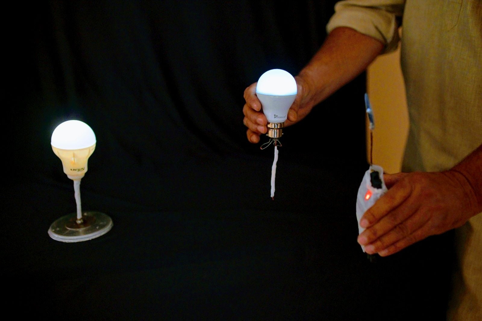 3.7Vの送信機が、信号を受信して電気に変換する回路を備えた2つのLED電球にRF信号を送信します。