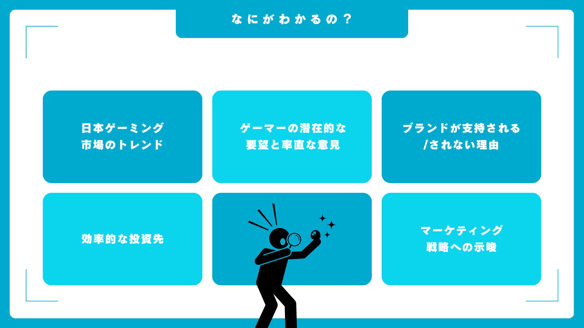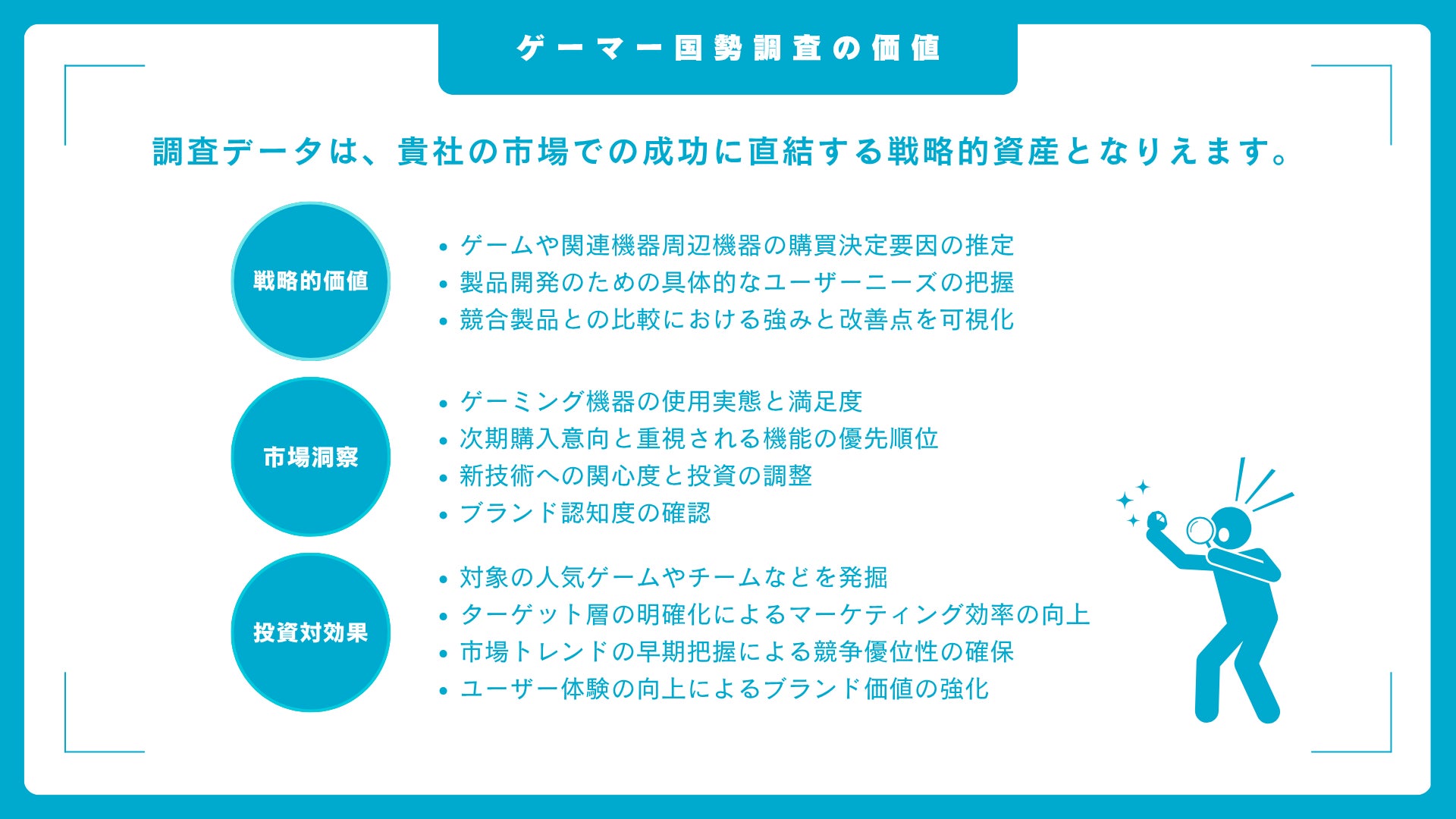 これらのデータは、製品開発、マーケティング戦略の策定、投資判断、新規市場参入など、多岐にわたるビジネスシーンでご活用いただけます。中立性と客観性を重視して設計・分析されたゲーマー国勢調査データは 、最新の市場トレンドを正確に把握し、次の一手を検討するための強力な羅針盤となるでしょう。