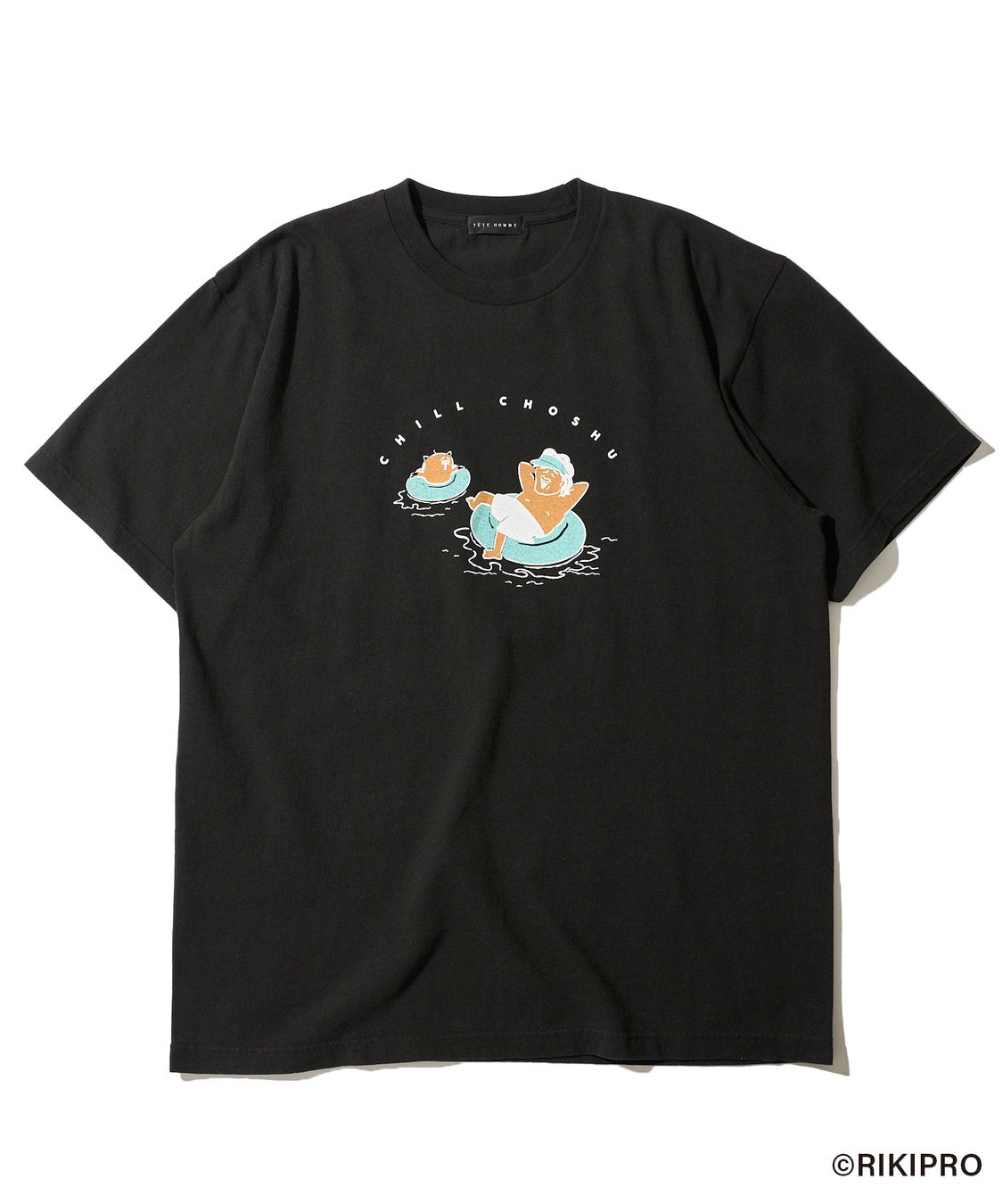 海が好きな長州さんが浮き輪で浮いているデザイン。T シャツのわきにステッチは無く丸胴のデザインで肌に当たるごろつきを無くしています。やや大きめのシルエットにして 2 サイズ展開のためレディースからメンズまで幅広く着れるような形となっています。