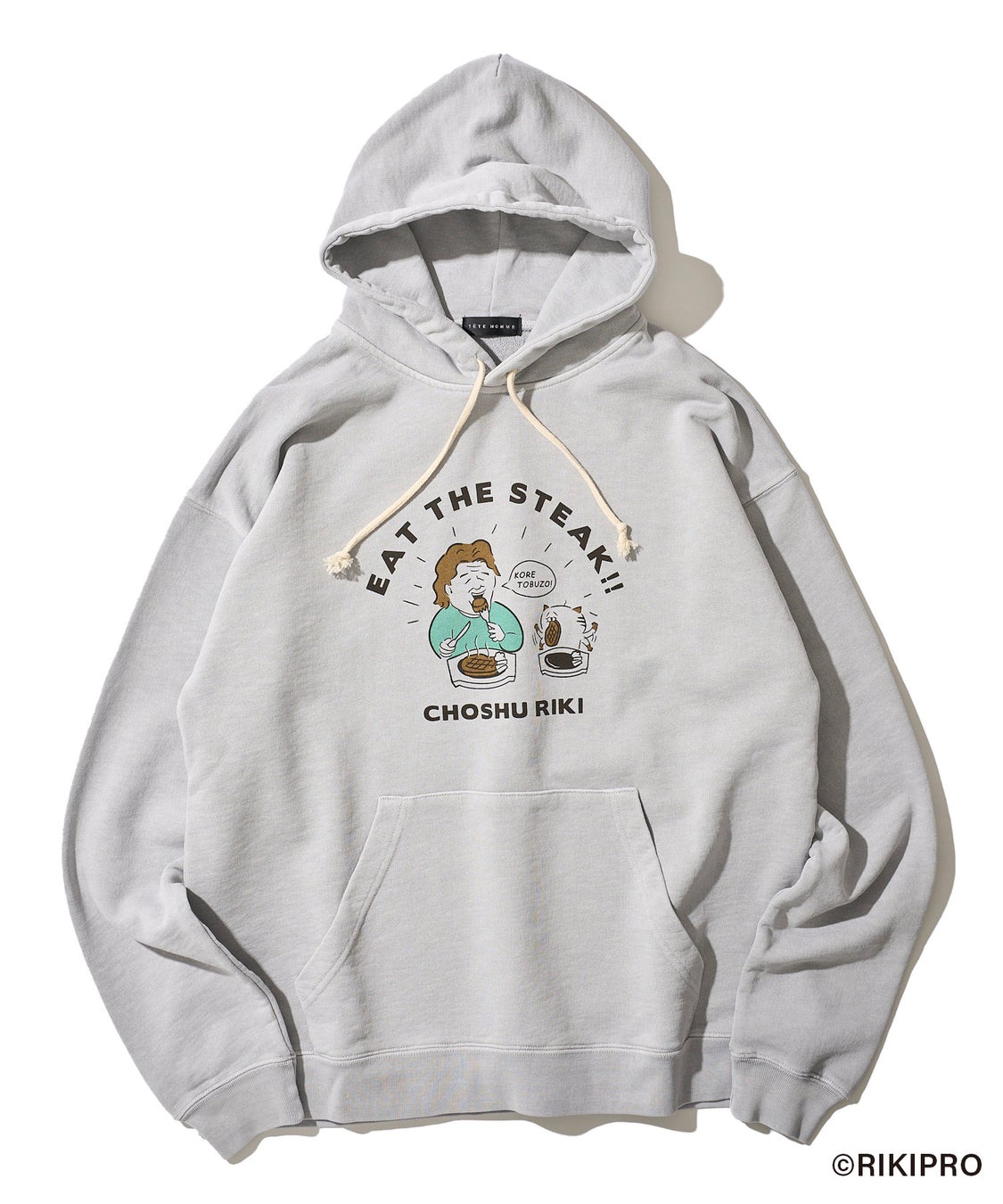 ステーキを今でも 600 グラム食べる長州さんがステーキを食べているモチーフプリントパーカー。ヘビィウェイト裏毛コットン 100%のボディを使用したパーカーでタフに着れる素材。表面にムラと粗野感のあるオリジナル裏毛生地をピグメントバイオ加工(USED加工)を施し着古された雰囲気を出しています。フェード感のあるスウェットボディはリラックスできるゆとりのあるシルエット。