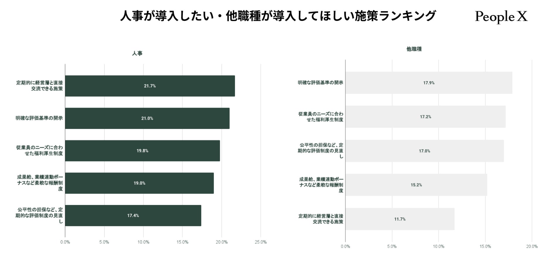 人事、他職種ともに導入希望ランキングTOP5の項目は変わらず、求めている施策のズレがないという結果が見て取れます。「経営層との交流」が人事では1位、他職種でも5位に選出されており、経営層と従業員のさらなる交流に前向きな姿勢が見て取れました。