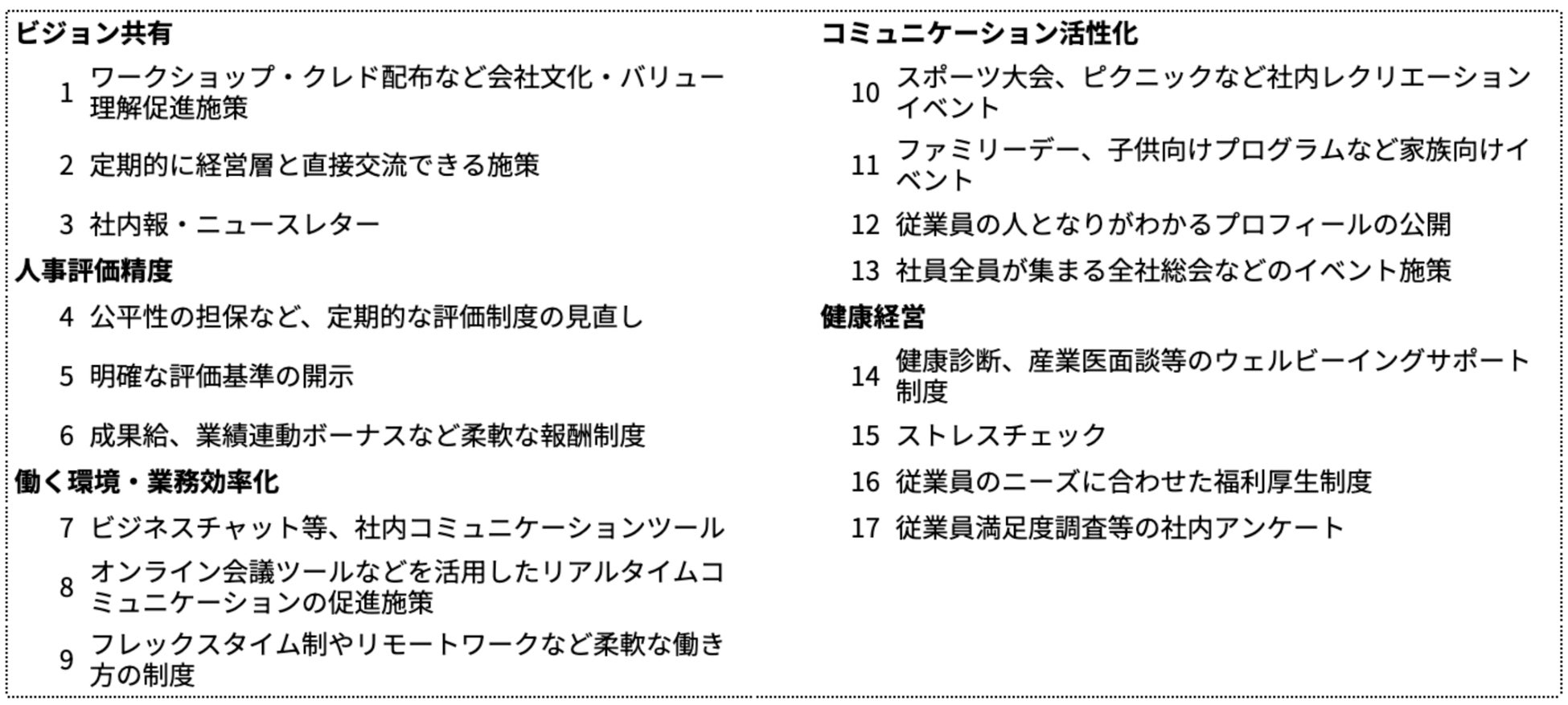 今回、エンプロイーサクセスの実態を把握するために行った本調査から、エンゲージメント向上施策の17項目に焦点を当て、取り組み状況や満足度について分析を行いました。