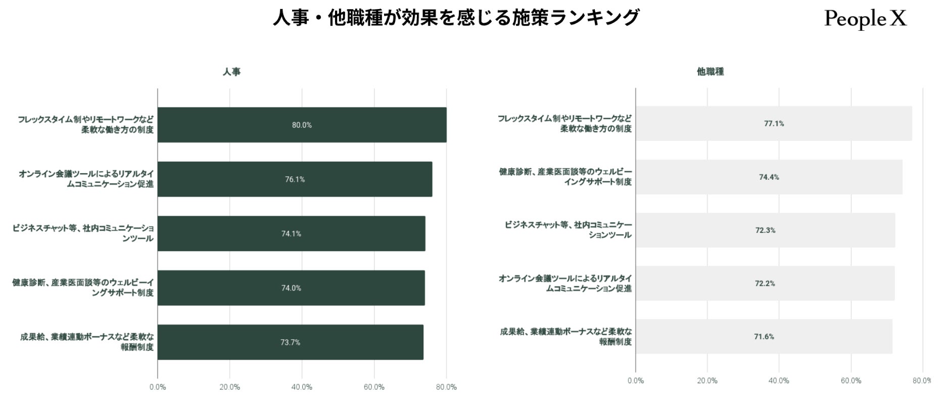 人事・他職種それぞれに、自社で導入されている施策のうち、その効果について質問したところ、人事・他職種ともに1位「フレックスタイム制やリモートワークなど柔軟な働き方の制度」、5位「成果給、業績連動ボーナスなど柔軟な報酬制度」という結果となりました。2位から4️位は順番こそ違えど「オンライン会議ツールなどを活用したリアルタイムコミュニケーションの促進施策」「ビジネスチャット等、社内コミュニケーションツール」「健康診断、産業医面談等のウェルビーイングサポート制度」がランクインしました。