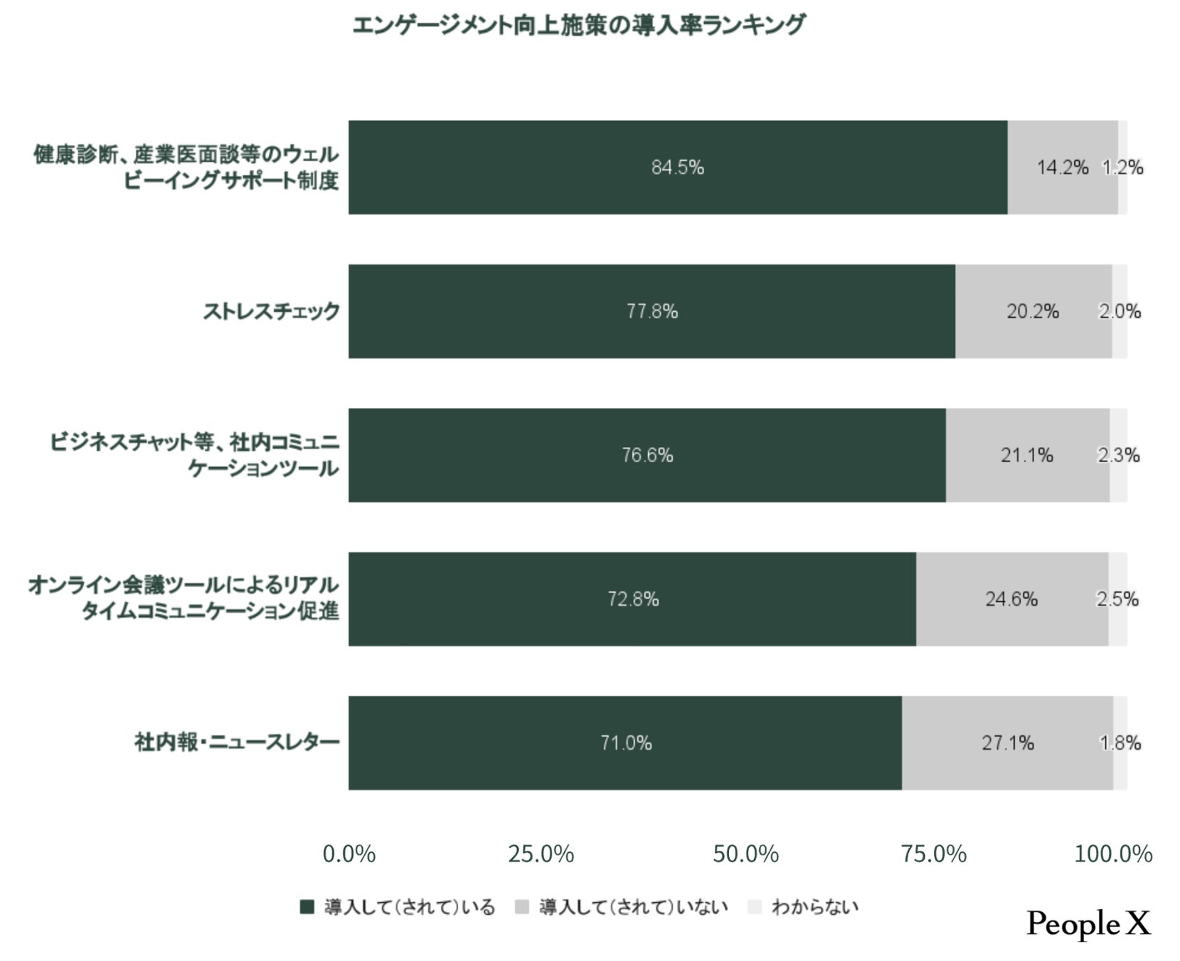 人事と他職種を対象に、エンゲージメント向上のために導入している施策について質問したところ、1位「健康診断、産業医面談等のウェルビーイングサポート制度(84.5%)」、2位「ストレスチェック(77.8%)」、3位「ビジネスチャット等、社内コミュニケーションツール(76.6%)」、4位「オンライン会議ツールなどを活用したリアルタイムコミュニケーションの促進施策(72.8%)」、5位「社内報・ニュースレター(71.0%)」という結果となりました。