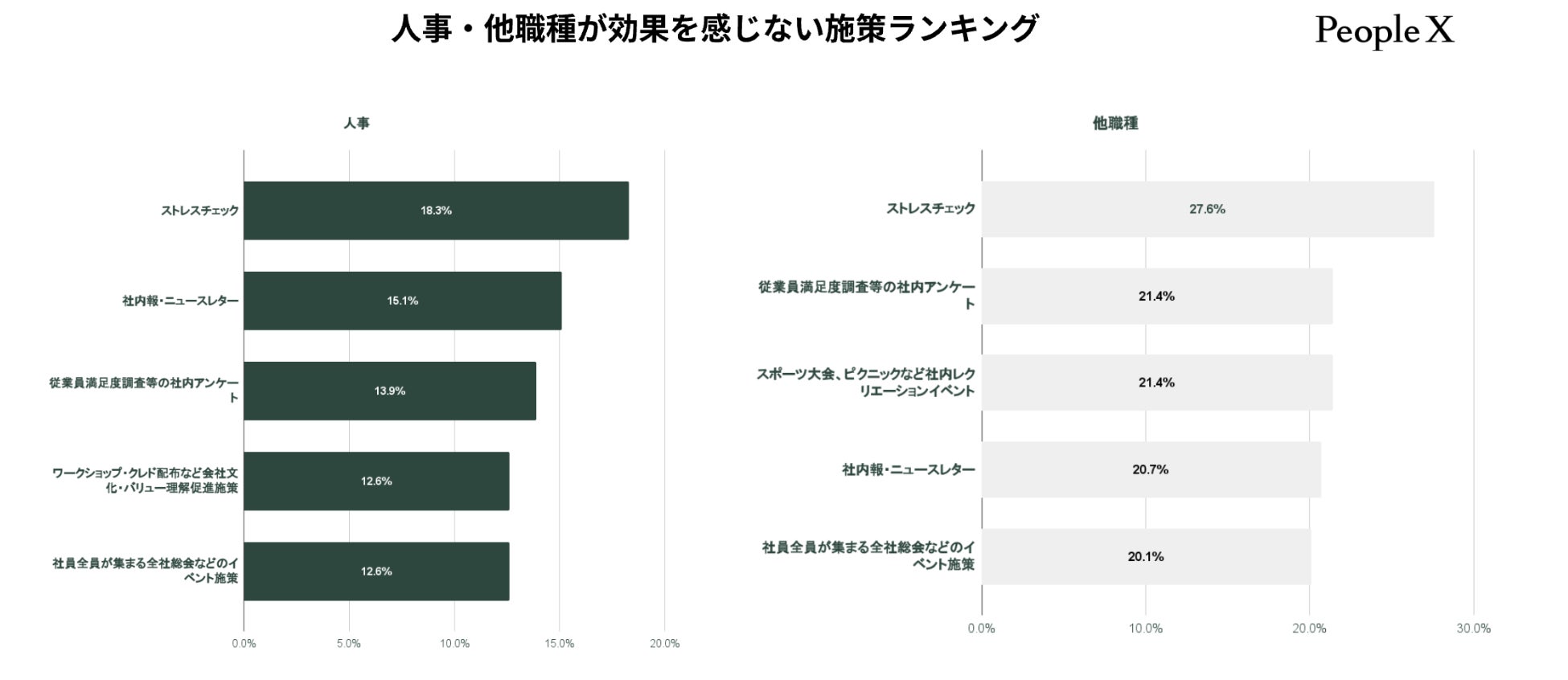 同じく、効果を感じて“いない”施策について質問したところ、人事・他職種ともに1位は「ストレスチェック」。2〜5位のうち3項目は「社内報・ニュースレター」「従業員満足度調査等の社内アンケート」「社員全員が集まる全社総会などのイベント施策」となり、順番こそ違えど人事・他職種同様のラインナップとなっています。