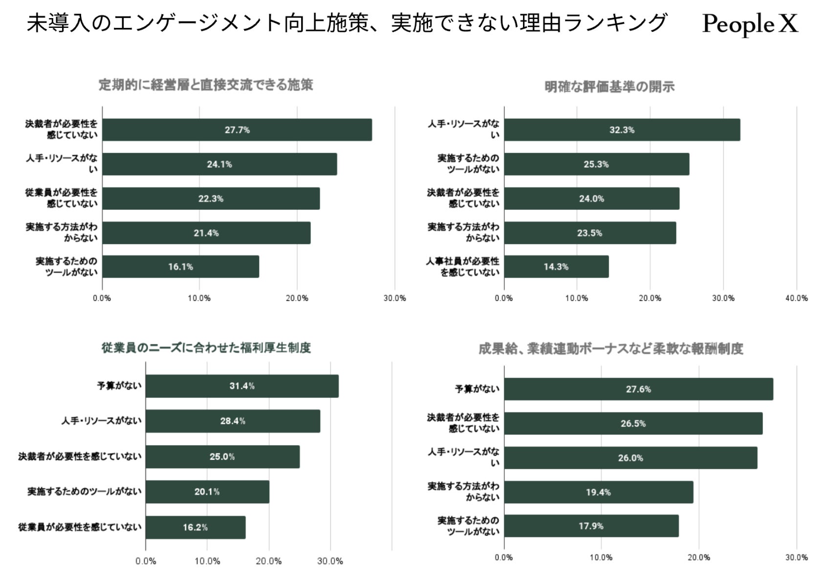 人事を対象に、「未導入だが導入を希望する施策」について、実施できない理由について質問したところ、多くの施策で「人手・リソースがない」「決裁者が必要性を感じていない」が挙げられました。
