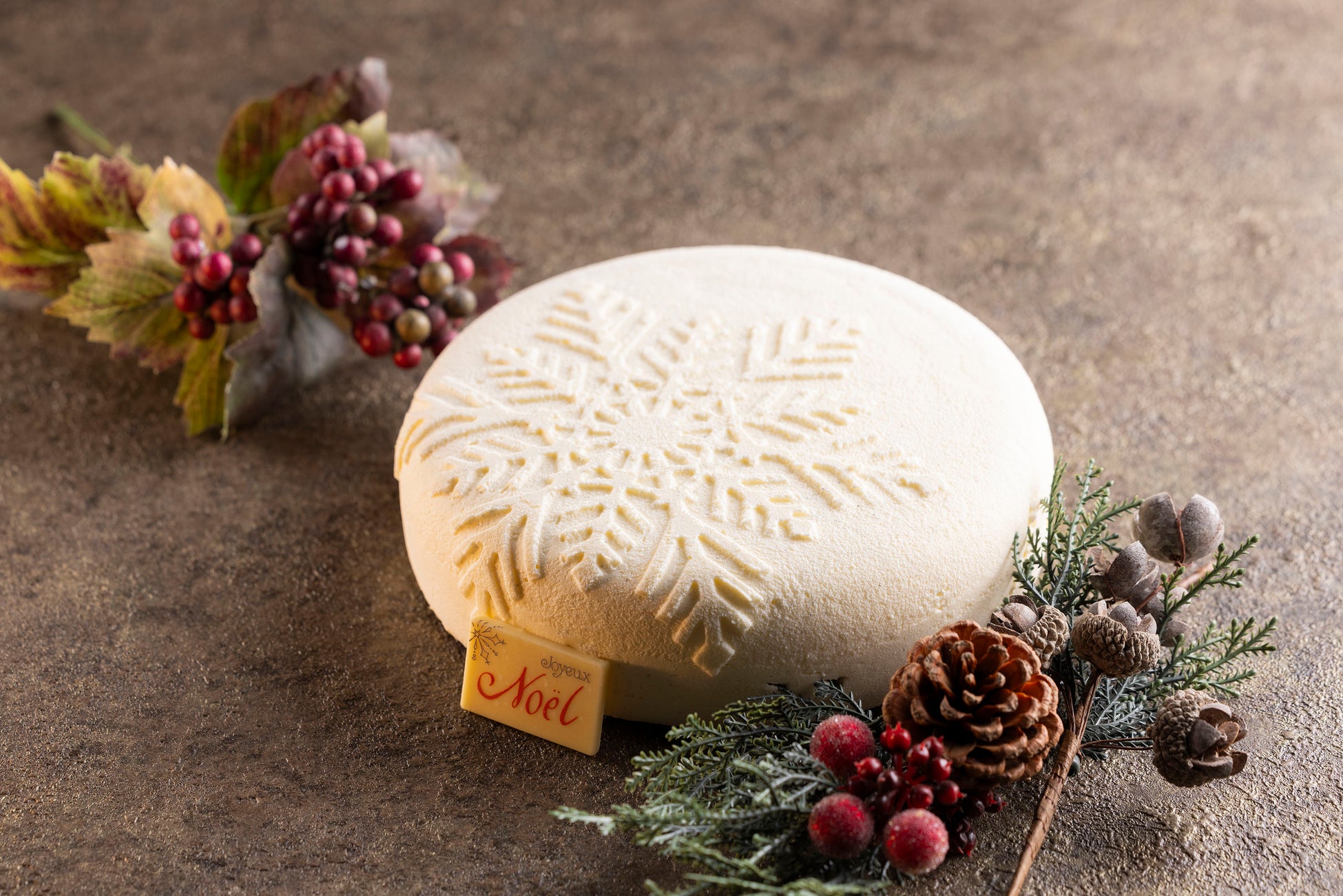 マダガスカル産バニラをふんだんに使用した滑らかなババロアで、鮮やかなベリーのジュレと黒砂糖のパンドジェンヌを包みました。雪の結晶をイメージしたエレガントなケーキで、味と食感のハーモニーをお楽しみいただけます。