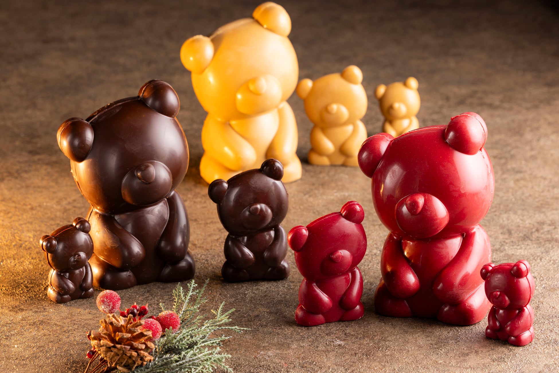 可愛らしいテディベアをそのままチョコレートに。中にはサクサクのライスクリスピーが入っています。ほんのりビターなダークチョコレート、キャラメル風味のブロンド、甘酸っぱいベリーチョコレートの3種類からお好みの風味とサイズをお選びください。