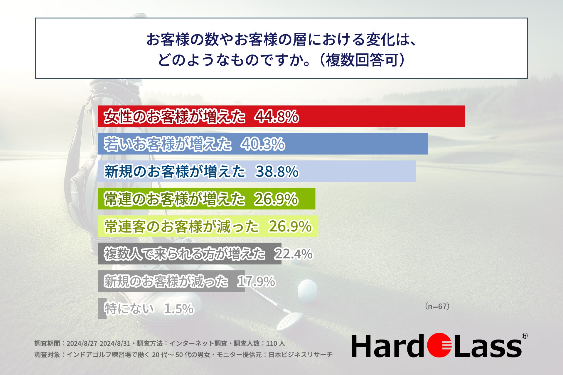 また、「インドアゴルフ練習場の仕事に近年変化を感じる」と回答された方に「お客様の数やお客様の層における変化は、どのようなものか」を尋ねる設問の回答では1位が「女性のお客様が増えた」で44.8%、次いで2位が「若いお客様が増えた」で40.3%、3位が「新規のお客様が増えた」で38.8%となりました。この結果から、近年での客層の変化としては女性や若年層の方がインドアゴフルフ練習場を活用しているとわかりました。