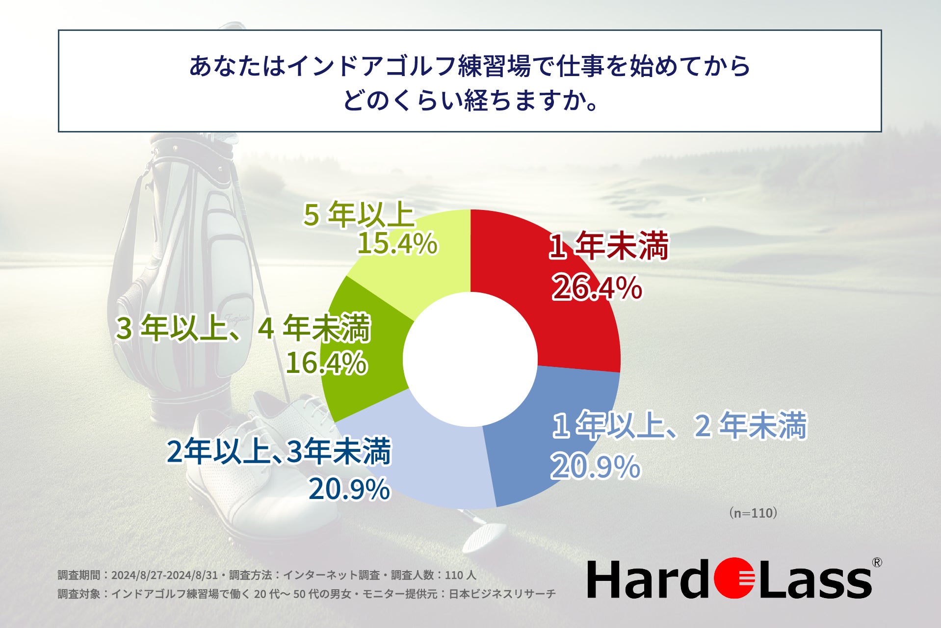 まず、「インドアゴルフ練習場で仕事を始めてどのくらい経つか」を尋ねる設問の回答では1位が「1年未満」で26.4%、2位と3位が同率で「1年以上、2年未満」と「2年以上、3年未満」で20.9%という結果になりました。インドアゴルフ練習場は施設自体が増加傾向にあることもあり、そこで働く方も働き始めてから比較的期間の短い方が多いとわかりました。