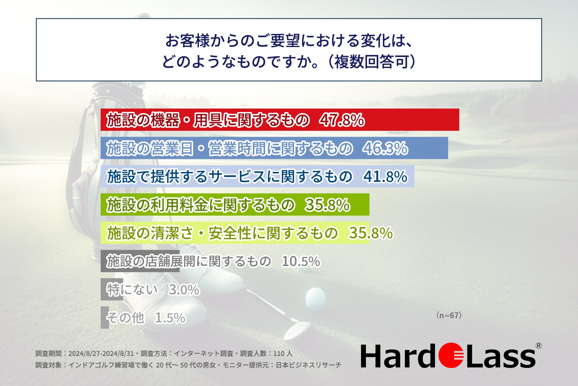 次に、「インドアゴルフ練習場の仕事に近年変化を感じる」と回答された方に「お客様からのご要望における変化は、どのようなものか」を問う設問の回答では、1位が「施設の機器・用具に関するもの」で47.8%、2位が「施設の営業日・営業時間に関するもの」で46.3%、3位が「施設で提供するサービスに関するもの」で41.8%という結果になりました。この結果から、様々な項目に関して要望はあるものの、最も多い要望は「施設の機器・用具に関するもの」であることが明らかになりました。