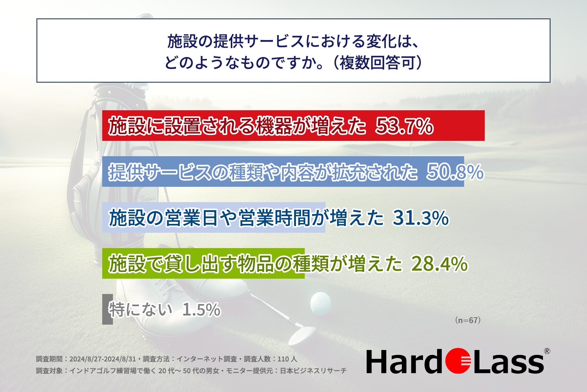 最後に、「インドアゴルフ練習場の仕事に近年変化を感じる」と回答された方に、「施設の提供サービスにおける変化は、どのようなものか」を問う設問の回答では、1位が「施設に設置される機器が増えた」で53.7%、2位が「提供サービスの種類や内容が拡充された」で50.8%、3位が「施設の営業日や営業時間が増えた」で31.3%という結果になりました。ここでは、いずれも施設利用者であるお客様へのサービスを強化するような内容の変化が上位に並ぶ結果となりました。