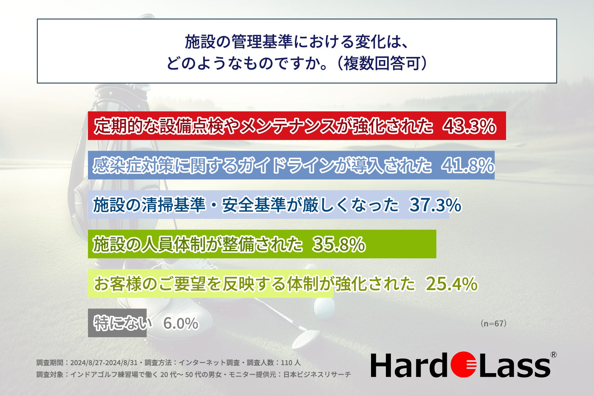 また、「インドアゴルフ練習場の仕事に近年変化を感じる」と回答された方に「施設の管理基準における変化は、どのようなものか」を尋ねる設問の回答では、1位が「定期的な設備点検やメンテナンスが強化された」で43.3%、2位が「感染症対策に関するガイドラインが導入された」で41.8%、3位が「施設の清掃基準・安全基準が厳しくなった」で37.3%という結果になりました。ここからは、コロナ禍を経て起きた変化が顕著に見られる結果となりました。