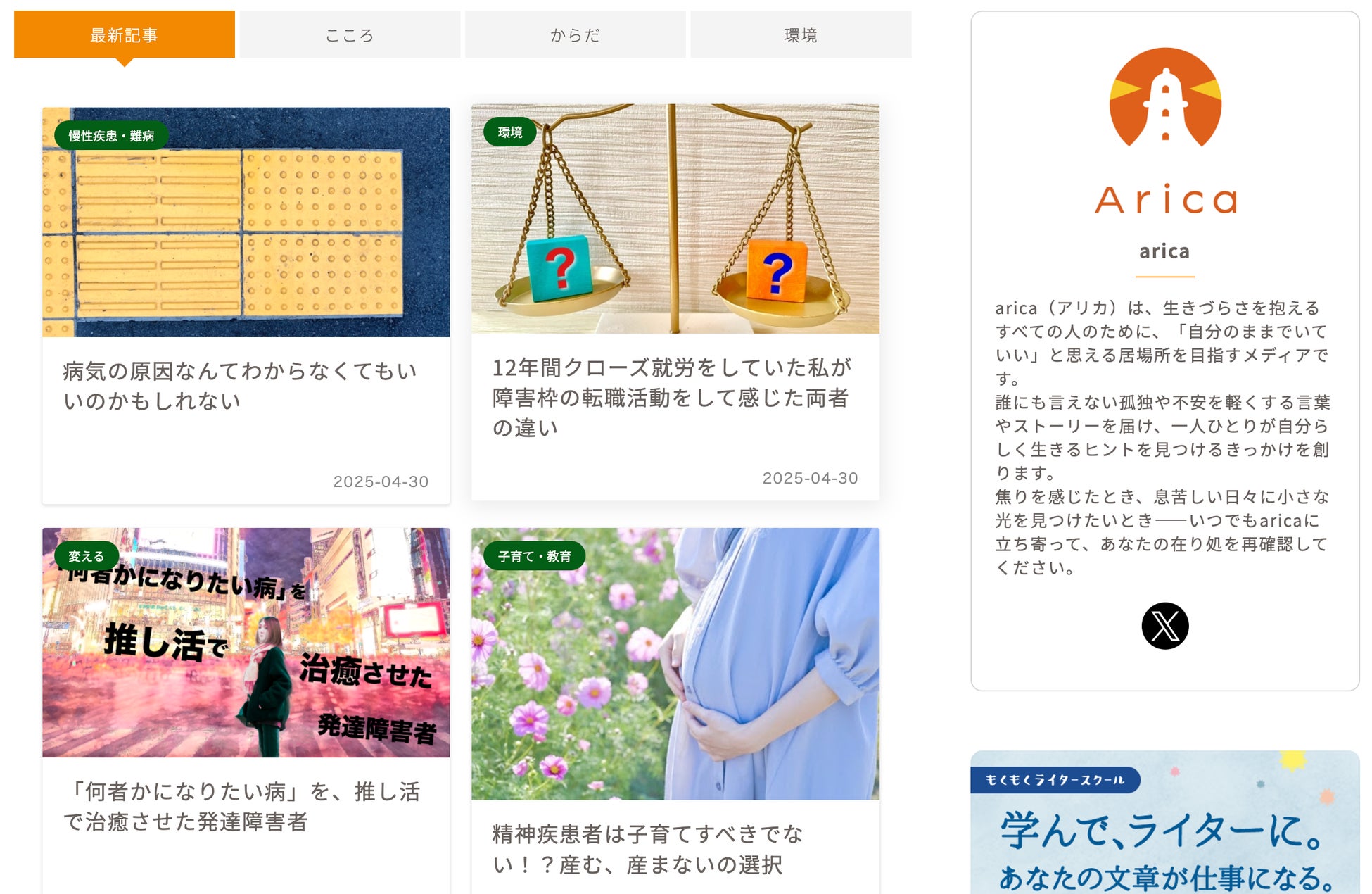 『Arica(アリカ)』は、生きづらさと向き合う人たちのリアルな体験や学びを記事として配信するオウンドメディアです。孤独や不安、違和感と向き合いながら見つけた気づきや、自分らしく生きるための工夫、心を軽くする学びや経験を共有する記事を配信し、読者へ自分自身の「在り処=Arica」を見つめ直す場所になることを目指しています。