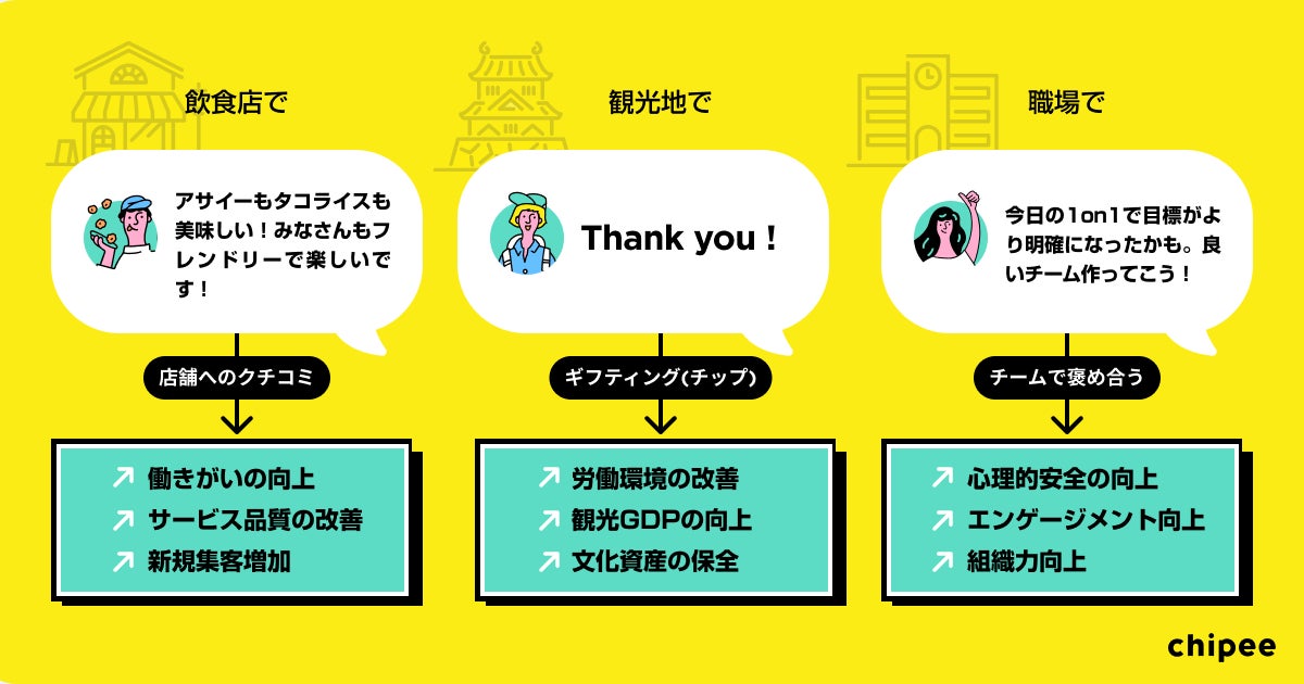 「Chipee(以下、チッピー)」は、感謝や応援のキモチをスマートフォンから簡単におくることができるサービスです。飲食店、フィットネスジム、カルチャースクール、自治体などすでに100店舗以上で導入されています。「チッピー」を通じて、これまで可視化されていなかったユーザーの気持ちや感謝の声が多く寄せられており、その声を各事業者にフィードバックすることで、スタッフのモチベーション向上などプラスの効果を生み出しています。