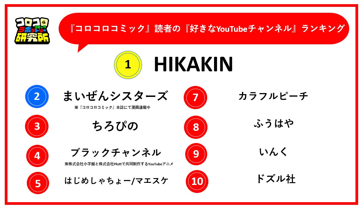 『コロコロコミック研究所』、イマドキ男子小学生に聞いた好きな「YouTubeチャンネル(YouTuber)」ランキング発表~1位「HIKAKIN」に迫る2位は、あの大人気ゲームの実況者!~