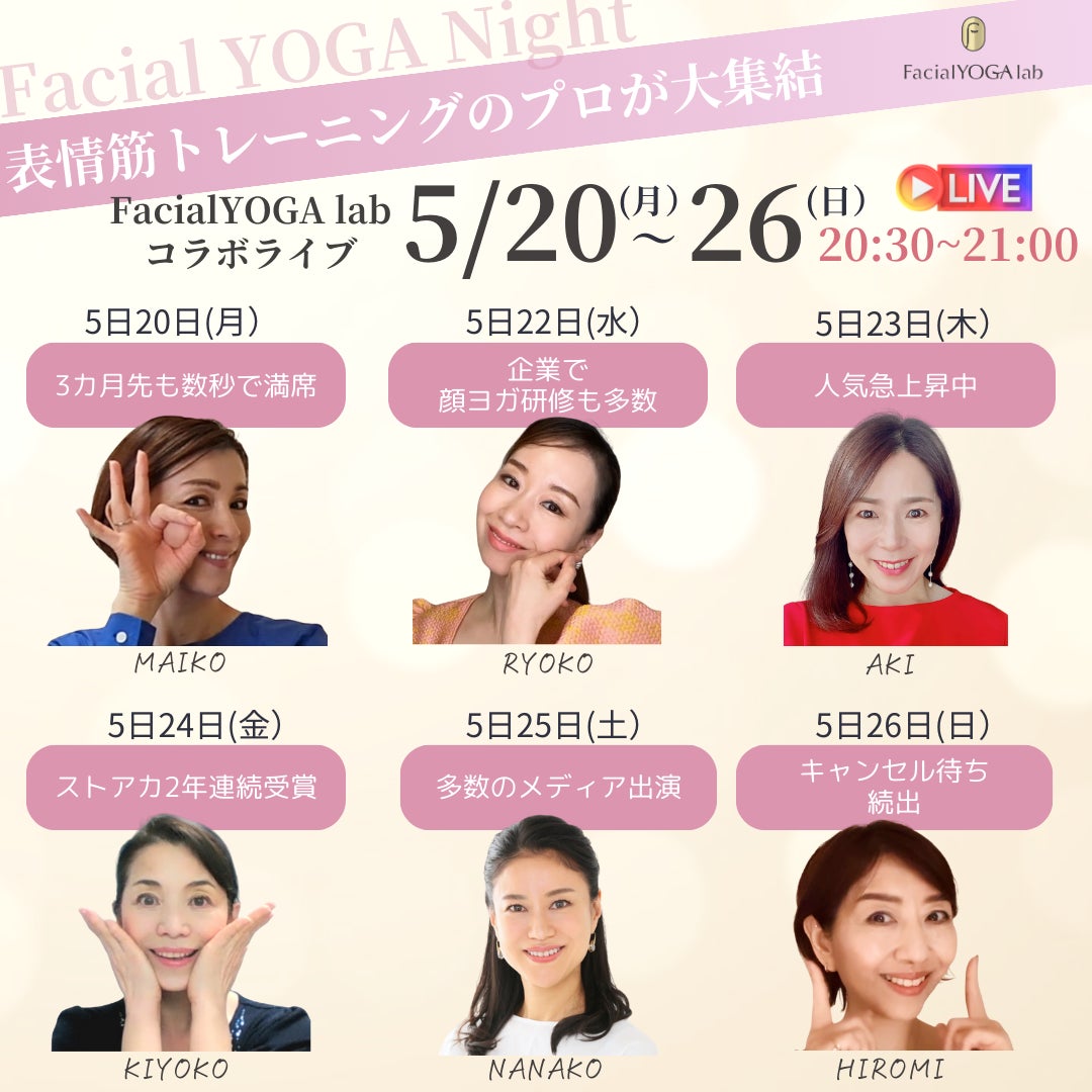 FacialYOGA lab®が大人気の顔ヨガスペシャリストを迎えた、1週間のナイトタイムインスタライブ(20:30-21:00予定)を行ないます。FacialYOGA lab 公式インスタグラムアカウントから視聴可能です。顔ヨガレッスンを始めてみたい方、顔ヨガ初心者の方、顔ヨガ経験者の方、 だれでも楽しめる内容になっています。表情筋を知り尽くした大人気のプロの先生からコツを学べる貴重な機会を提供します。詳細情報は公式ホームページ、各種公式SNS(インスタグラム、LINE、X)から発信します。
