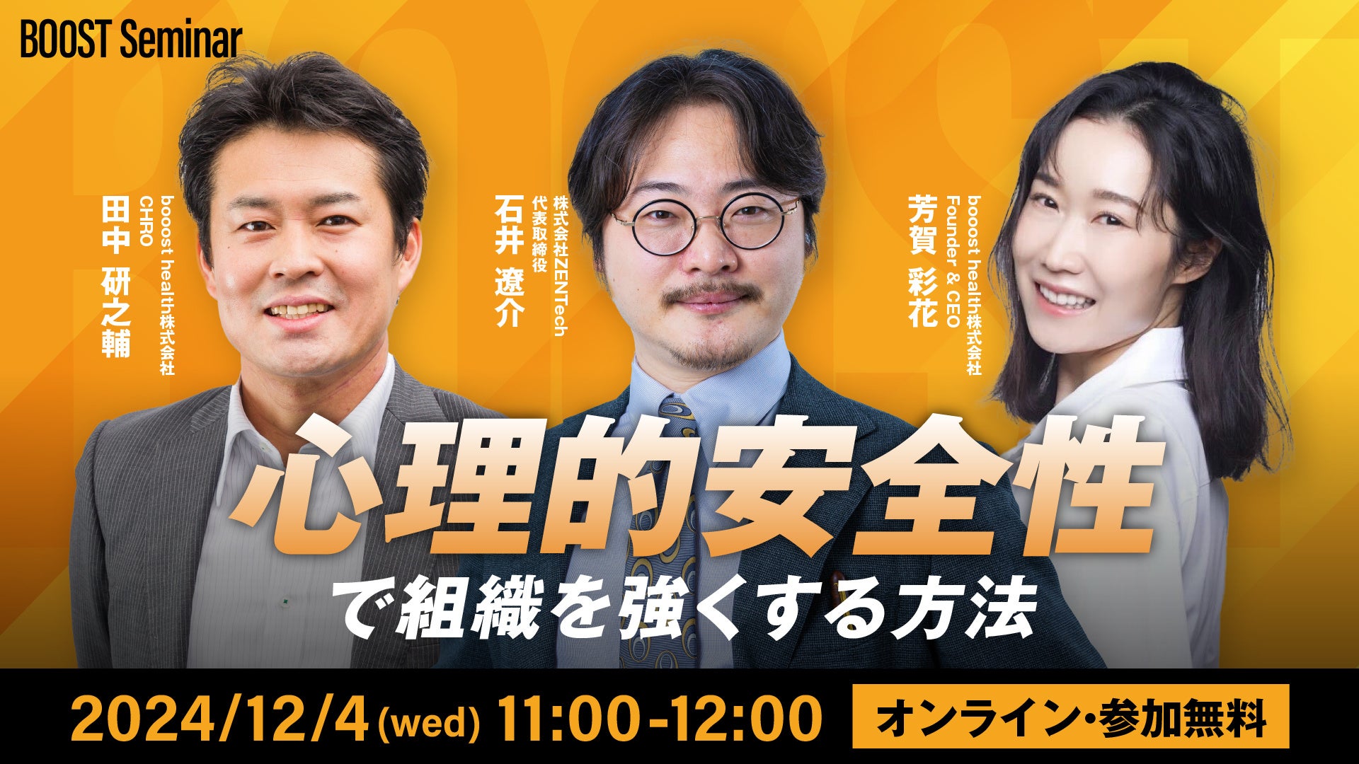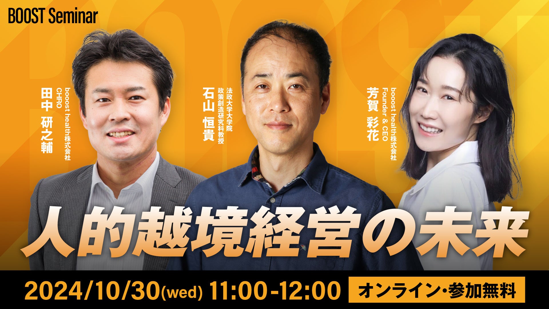 booost health株式会社(東京都中央区、代表取締役CEO・創業者:芳賀彩花)は、専門家と解き明かす、組織と個人の成長を加速させるこれからの人材戦略をテーマに「BOOST Seminar」を開催します。10月30日(水)の初回セミナーでは法政大学大学院政策創造研究科教授 石山 恒貴氏をお招きし、booost health株式会社 CHRO 田中 研之輔、booost health株式会社 Founder & CEO 芳賀 彩花と「人的越境経営の未来」をテーマに対談します。