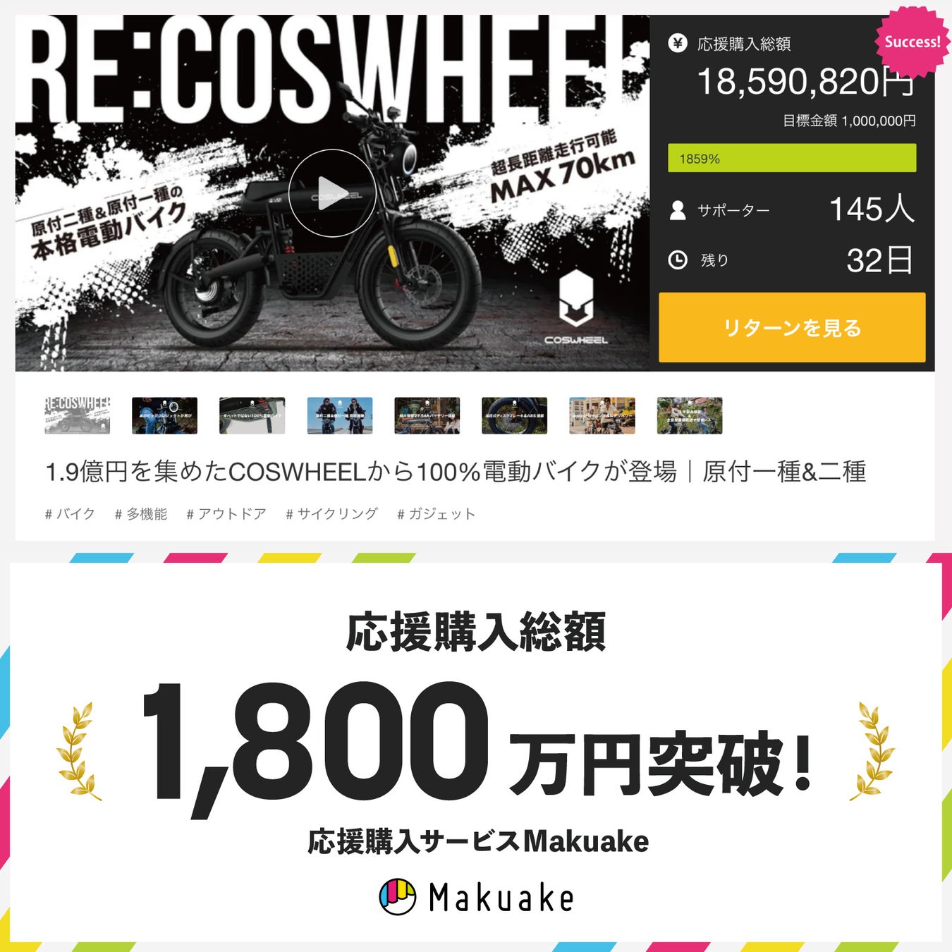 ▼Makuake史上電動バイク1位のCOSWHEEL MIRAIプロジェクトページ(2022年実施分)