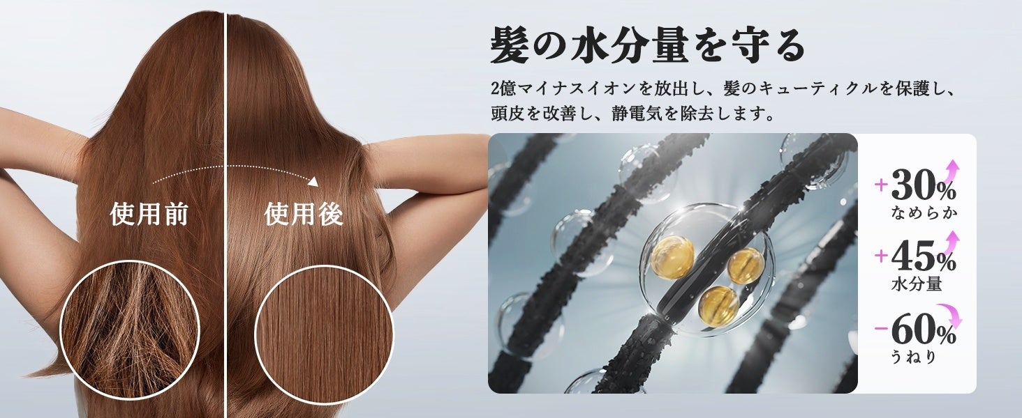 ハイスピードドライヤーは、高濃度2億マイナスイオン機能を搭載されて、髪に潤い、静電気を軽減し、髪を保護し、光沢のある髪を与えます。