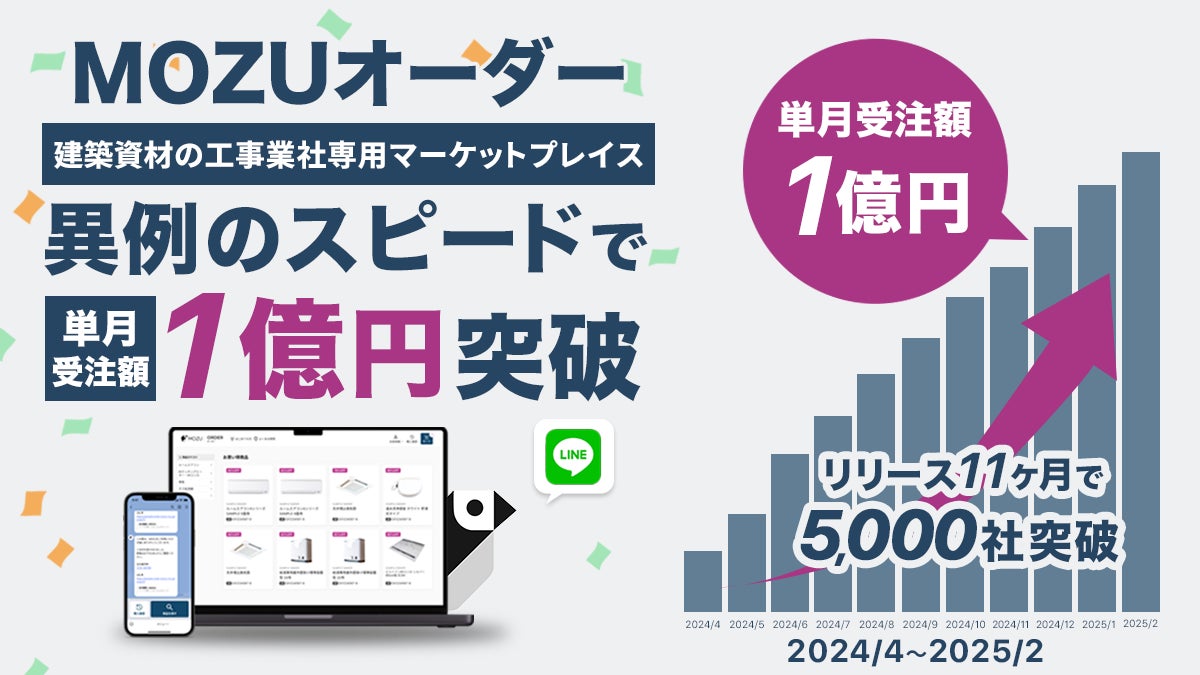 「産業変革で現場をおもしろく」を掲げるMOZU株式会社(本社:東京都港区、代表取締役CEO:野口真平、COO:竹内達也)は、運営する建築資材のマーケットプレイス「MOZUオーダー」が、2025年2月において単月受注額で1億円を突破し、さらに登録会員数も5,000社を達成したことをお知らせいたします。 2024年4月のサービス開始からわずか11ヶ月での記録達成となります。