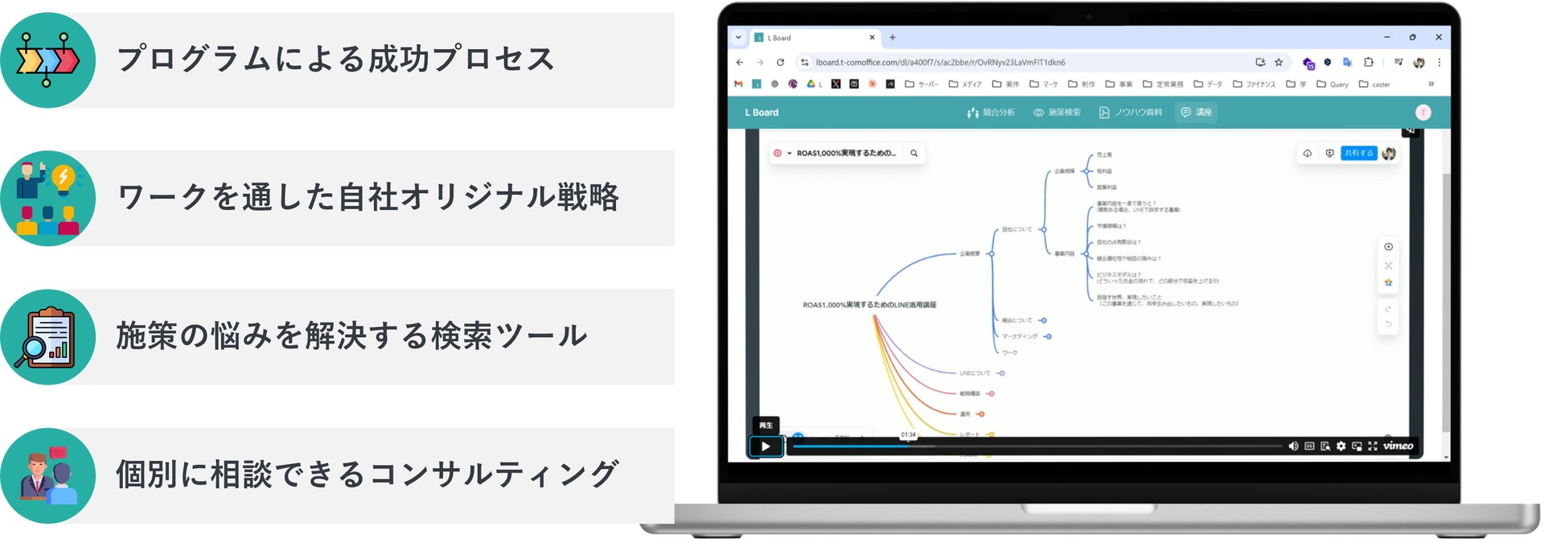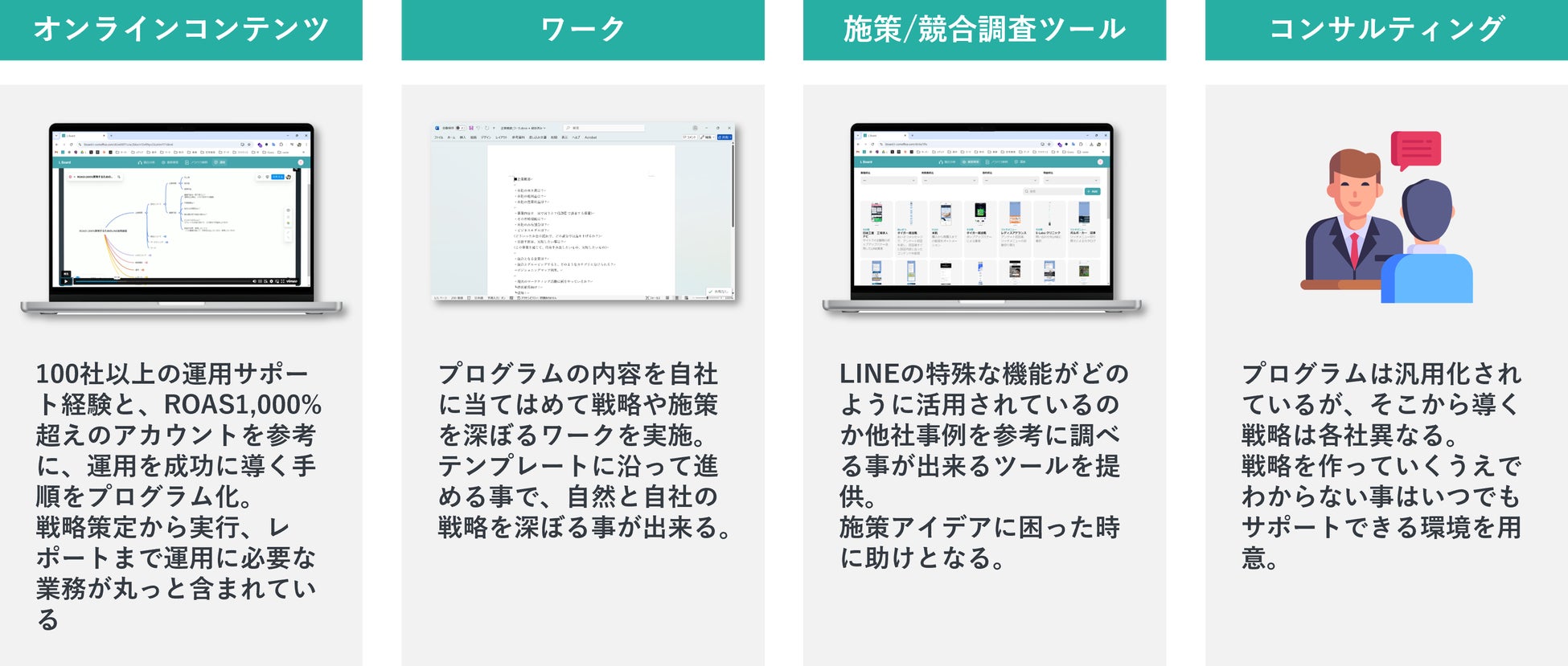 プログラムには、オンラインコンテンツやワーク、施策/競合調査ツール、コンサルティングが含まれています。