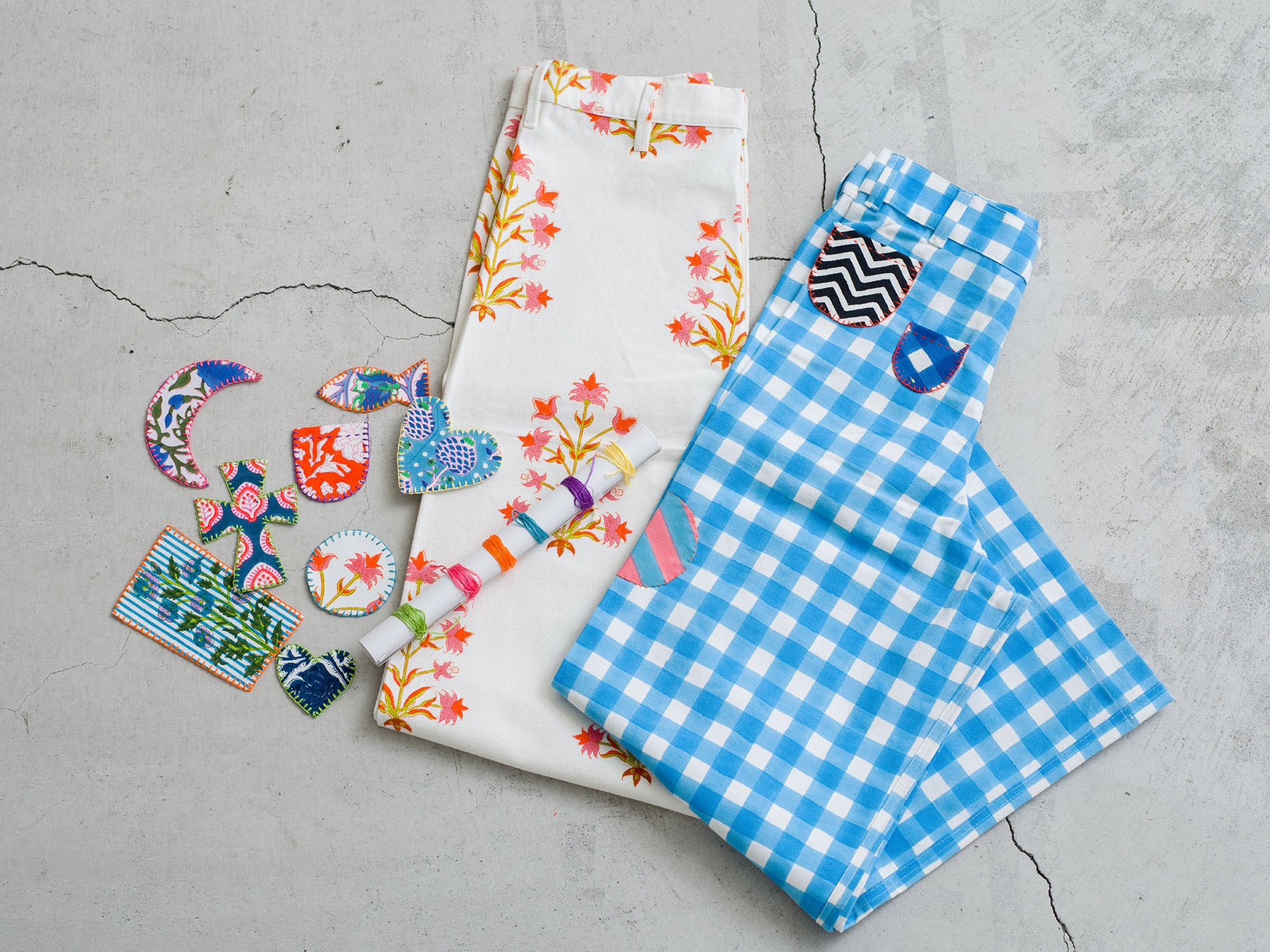 ブランドの定番アイテム、ディスコパンツに可愛いモチーフのパッチワーク刺繍をアレンジできるワークショップを開催。過去のアーカイブ生地を使用したハート、魚、クロス、月、ポケット、サークル、スクエアなど色とりどりのモチーフからお好きなものをお選びいただけます