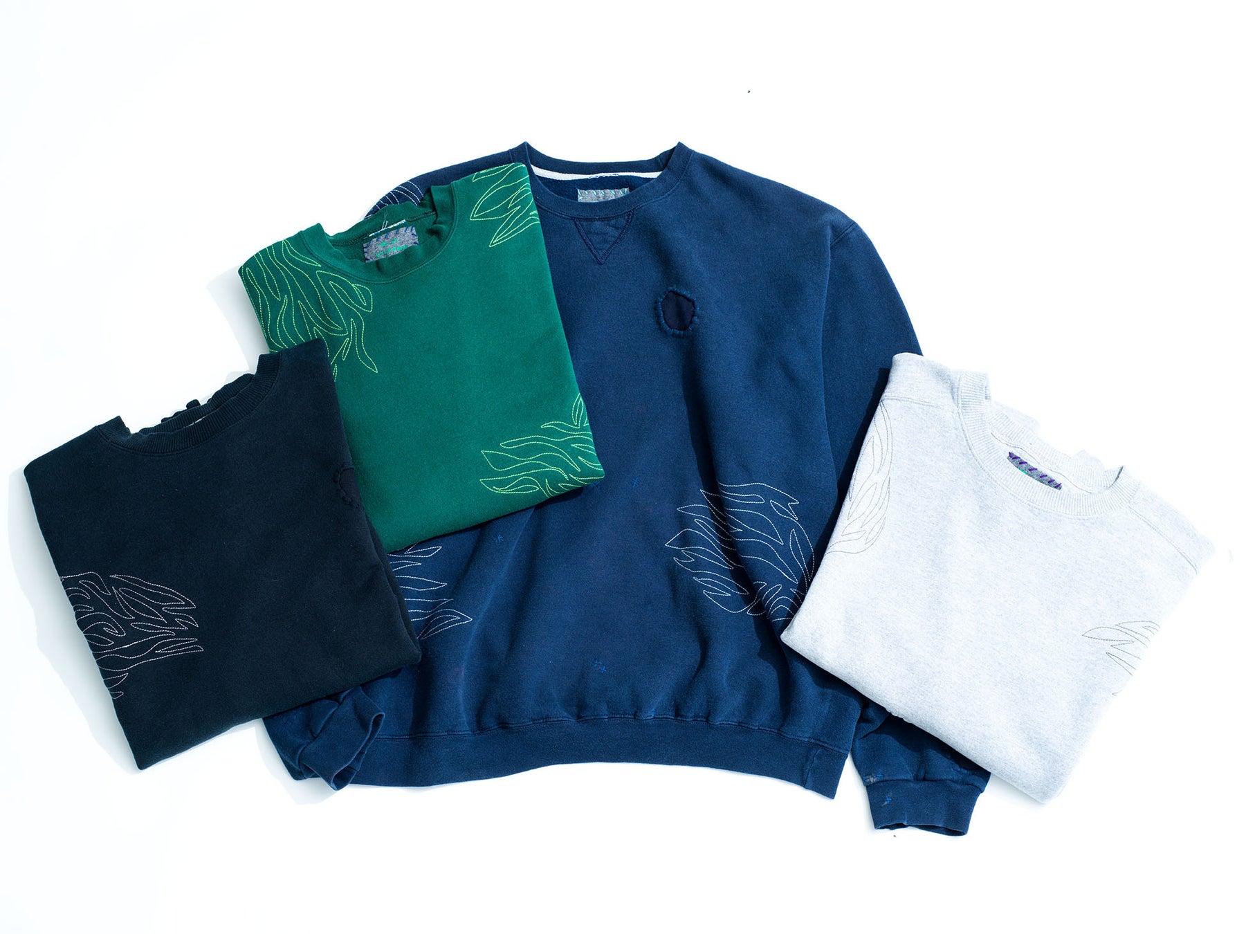 80年代後半~90年代のヴィンテージスウェットを1点1点アイテムの特徴に合わせてモチーフを配置した特別なアイテム。ステッチは炎や葉など、自然の中にあるone of a kindのモチーフをイメージしています