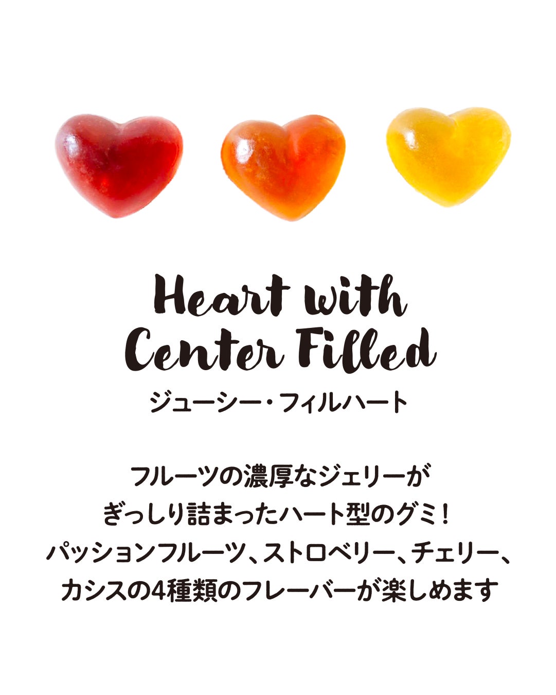 ハート型のグミの中に、フルーツの濃厚なジェリーがぎっしり詰まった『Heart with Center Filled(ジューシーフィルハート)』。マンゴーパッション、ピーチストロベリー、バナナチェリー、ラズベリーカシスの4種類のコンビネーションが楽しめ、噛むたびに異なる味わいが広がります。