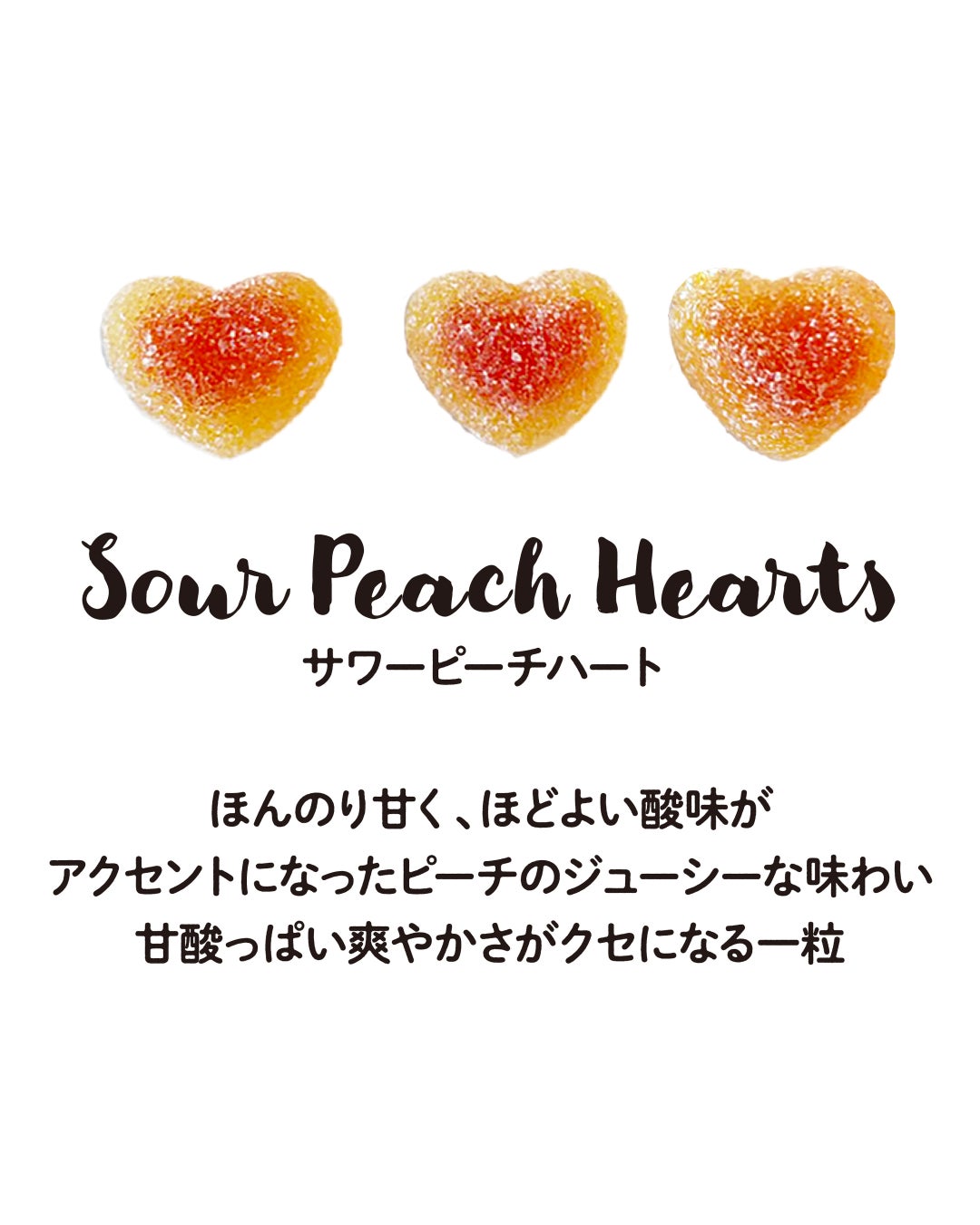 ほんのり甘く、ほどよい酸味がアクセントになった『Sour Peach Hearts(サワーピーチハート)』。ピーチのジューシーな味わいが広がり、爽やかさとともにクセになる一粒です。