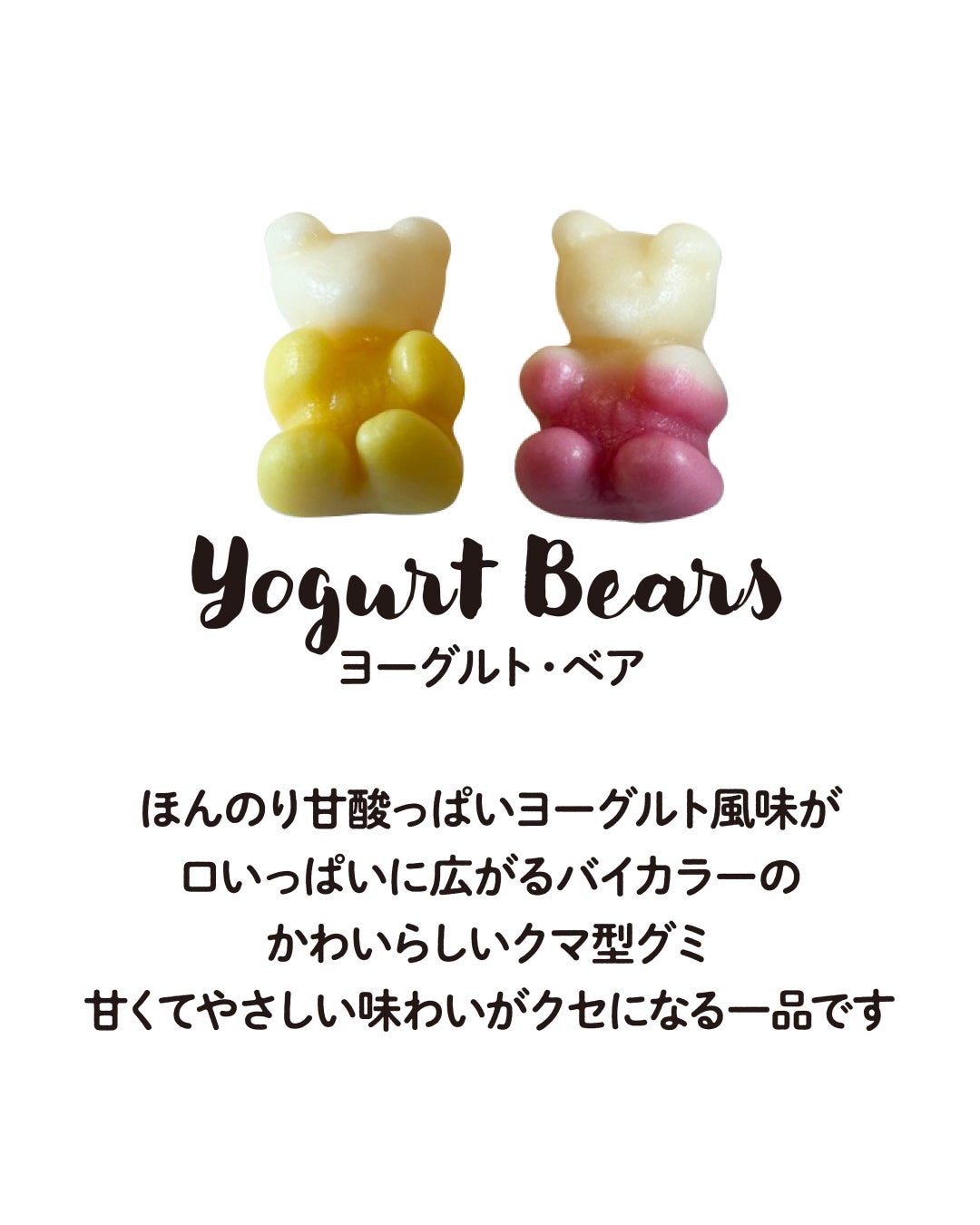 日本ではまだアイテムとしてなかった、クリーミーなヨーグルトの風味がたっぷり詰まった『Yogurt Bears(ヨーグルトベアー)』は、バイカラーの愛らしいクマ型が特徴。口に入れると、まろやかでほんのり甘酸っぱい味わいが広がり、後を引く美味しさが楽しめます。