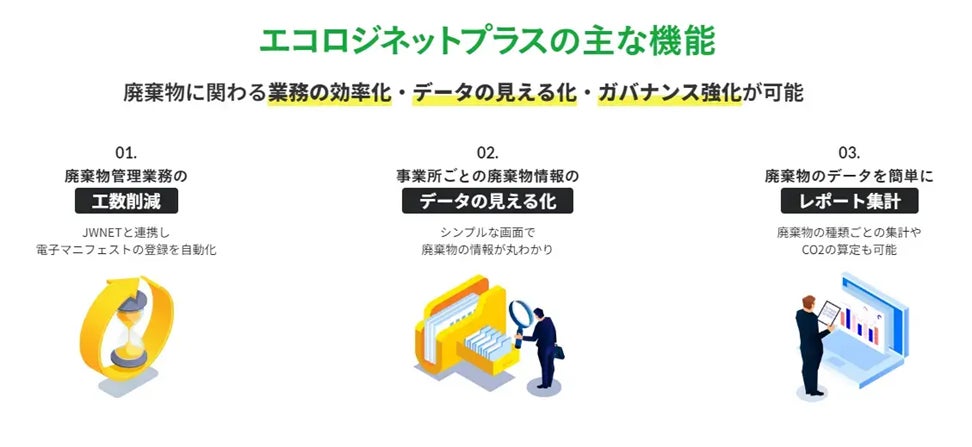 イーコスの廃棄物管理クラウドサービス「エコロジネットプラス」は、すべての事業者の廃棄物業務をシンプルに、効率化する「廃棄物管理クラウドサービス」です。「JWNET」と連携し、事業者の廃棄物情報を一元管理することで、廃棄物管理業務の工数削減、データの見える化、ガバナンス強化が可能になります。