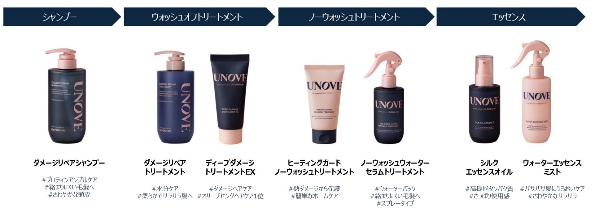 「羨望の柔らかさと香りで「私」を解き放つ」がコンセプトのUNOVEは2019~2023年に韓国最大のHealth&Beautyチャンネルであるオリーブヤングシャンプー部門にて5年連続受賞した同社のグローバルヘアケアブランドDr. for hairの技術力で誕生したパーソナルケアブランドです。 UNOVEは「羨望の柔らかな髪へ」導くために、ダメージ髪に潤いを与え、柔らかさや香りを基にムードをまとうことができるのが特徴です。
