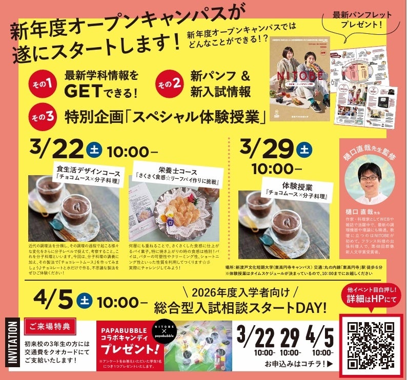 3月22日(土)より新年度向けのオープンキャンパスがスタートします!今年度は、新たな学びの可能性が広がる特別な年。新学科『フードデザイン学科』の誕生や、『専門実践教育訓練給付金』の対象校への選定、『文部科学省 未来を支える人材育成機能強化に向けた経営改革支援(令和7年1月17日付)』対象校に選定など、さまざまな進化を遂げた新渡戸文化短期大学が始まります。